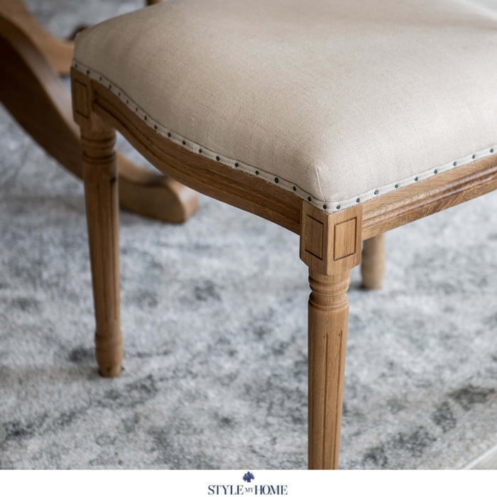Each seat is upholstered in 100% linen, providing breathable comfort and a naturally textured finish. A refined nailhead trim around the back of the seat adds a tailored, designer chair touch.