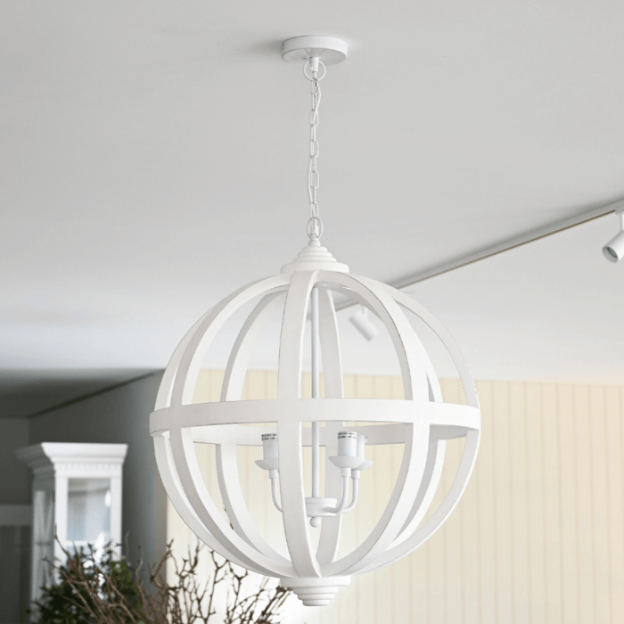 Our 'Orb' painted white rounded pendant lamp will give a rustic Hamptons accent to any interior. With the four arms and candle-shaped bulbs, this light will add rustic charm and personality to your interiors. Perfect for an entry, hallway or living / dining space. The timber construction provides a natural, warm touch that enhances the cozy, inviting feel of any Hamptons-inspired space.