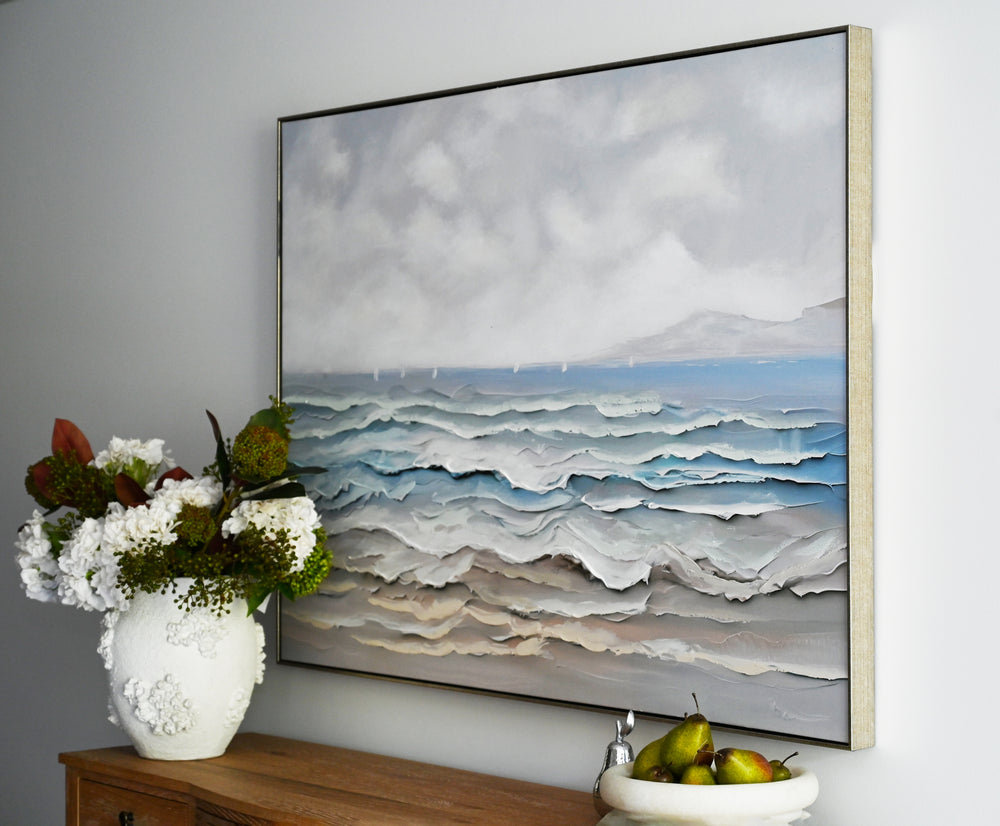 Each of our seascape canvases is designed in-house, with 70% hand-painted detailing for depth, texture, and artisanal character. They are exclusive to Style My Home and carefully curated to complement any home including Hamptons, coastal, and classic interiors.  The vast majority of out canvases are framed in a classic champagne frame which coordinates with any home.