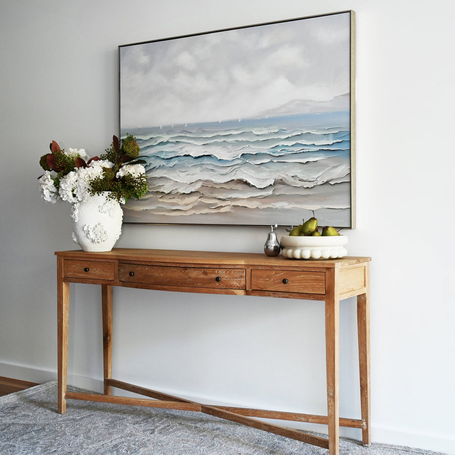 Just about anywhere! Large seascape artworks work beautifully in living rooms, bedrooms, hallways, or entryways—anywhere you want to create a sense of serenity and openness. Hung above a bed, sofa, or console, they act as a stunning focal point while setting a peaceful tone for the room. Our canvases also pair perfectly with Hamptons-style furniture and coastal-inspired décor. Smaller decorative canvases can be used in smaller hallway nooks, bathrooms, kitchens and even in a bookcase.