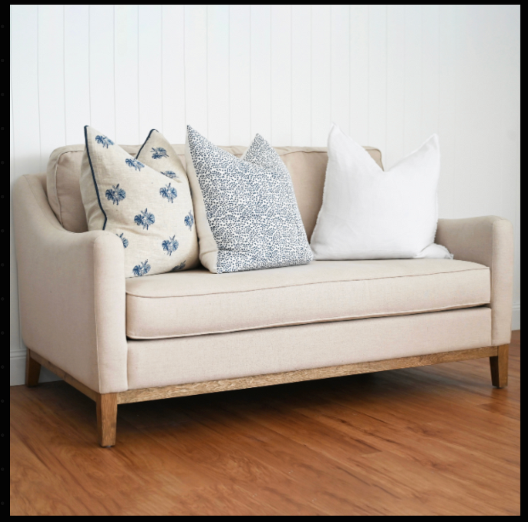 Our new Juliet 2 seater lounge or love seat is perfect for a smaller space or even the end of your bed or walk in wardrobe. The new batch is coming with white piping.