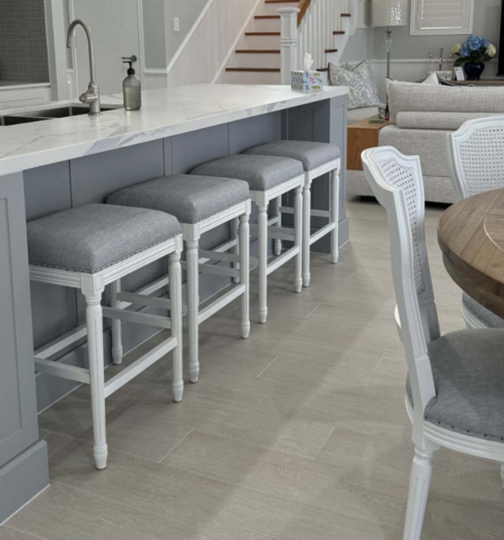 The popular April padded stool is now available in a backless design. Crafted from solid birch wood or oak wood, it features a frame finished in either white paint or oak. Upholstered in our signature linen fabrics, it is accented with nailhead trim along the edges. Supported by turned legs with a convenient footrest, this stool is an excellent option for those seeking a sleek linen look in their kitchen.