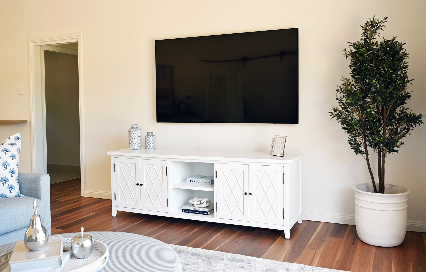 Our 'Ascot' large entertainment unit features stunning geometric fretwork detailing. This signature fretwork diagonal diamond design on the drawers creating a beautiful yet understated statement. The fretwork detailing is offset by its classic profile and simple brass knobs. This range is versatile enough to suit any home, whether it’s classic Hamptons, modern Hamptons, or even a contemporary space. The large entertainment unit offers ample storage with 2 cupboards and an open middle section. This is also available in a smaller size.