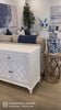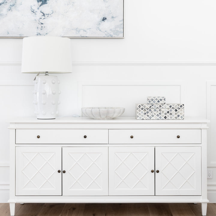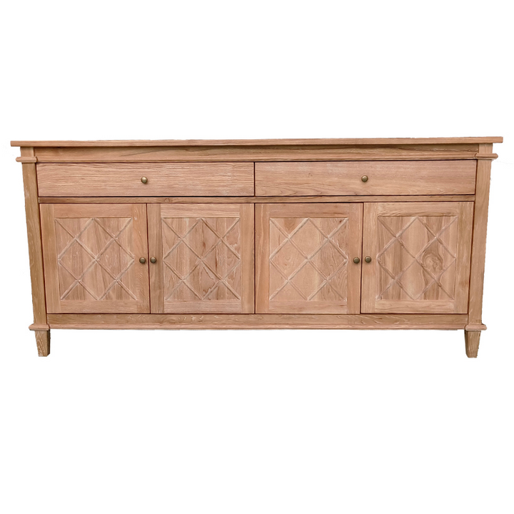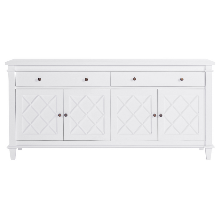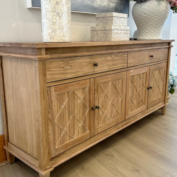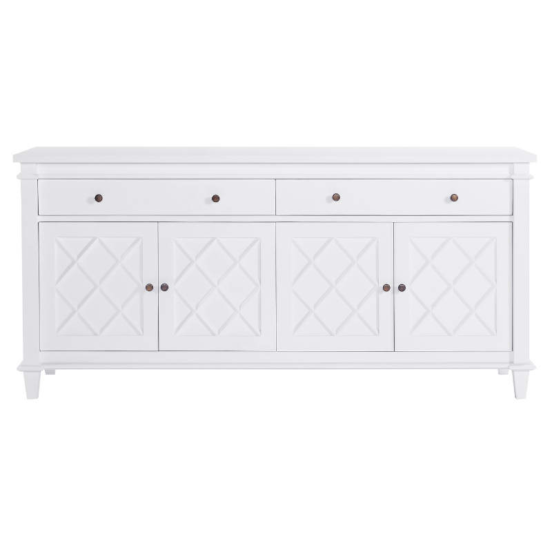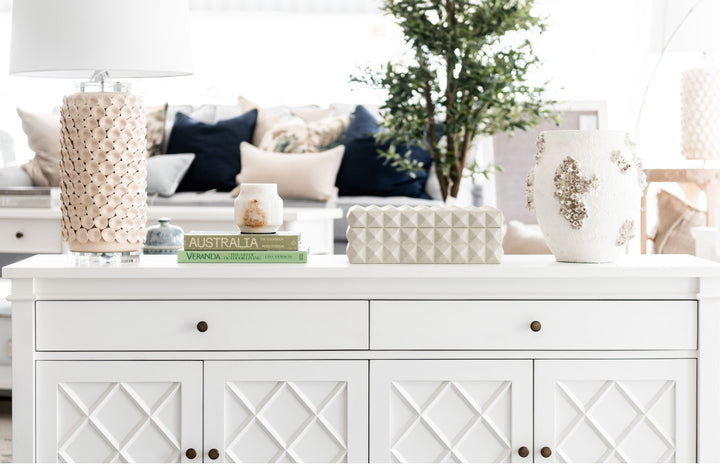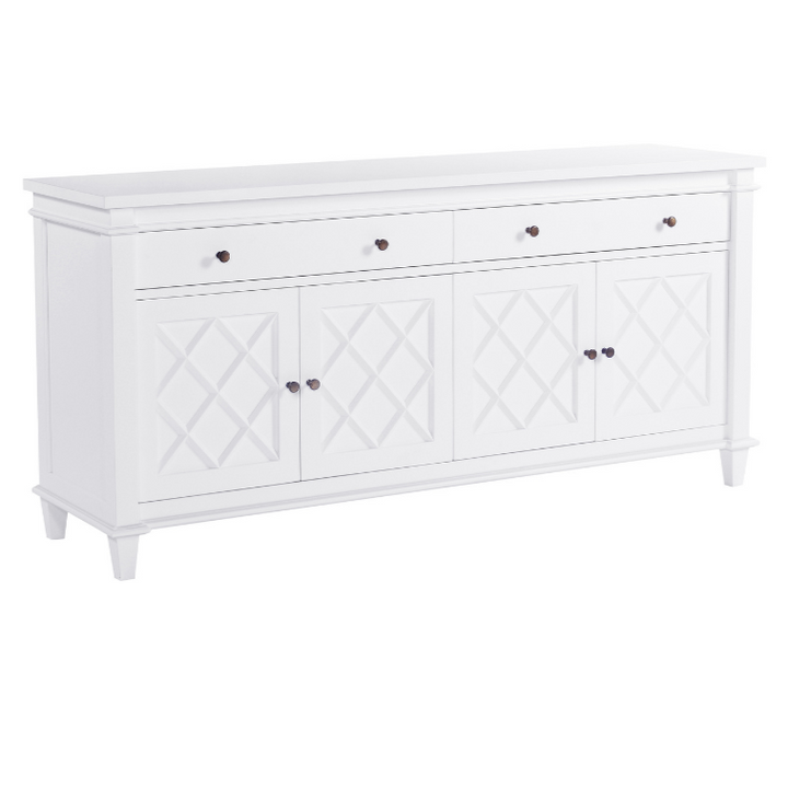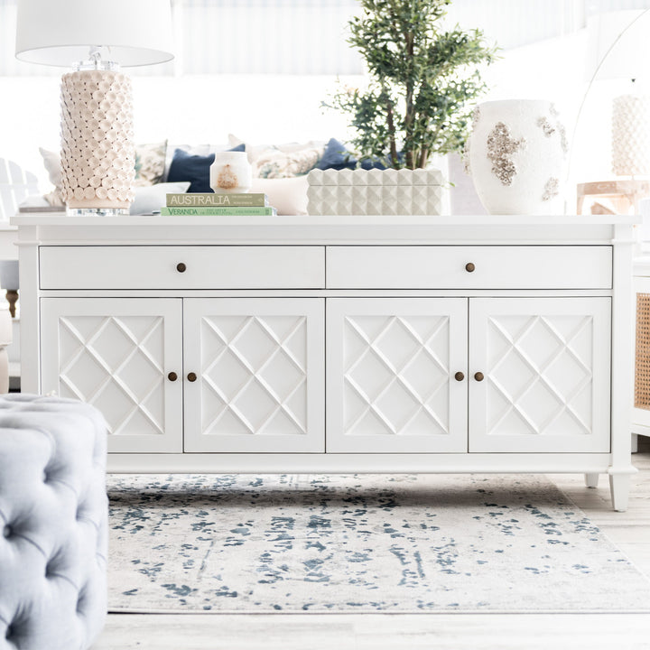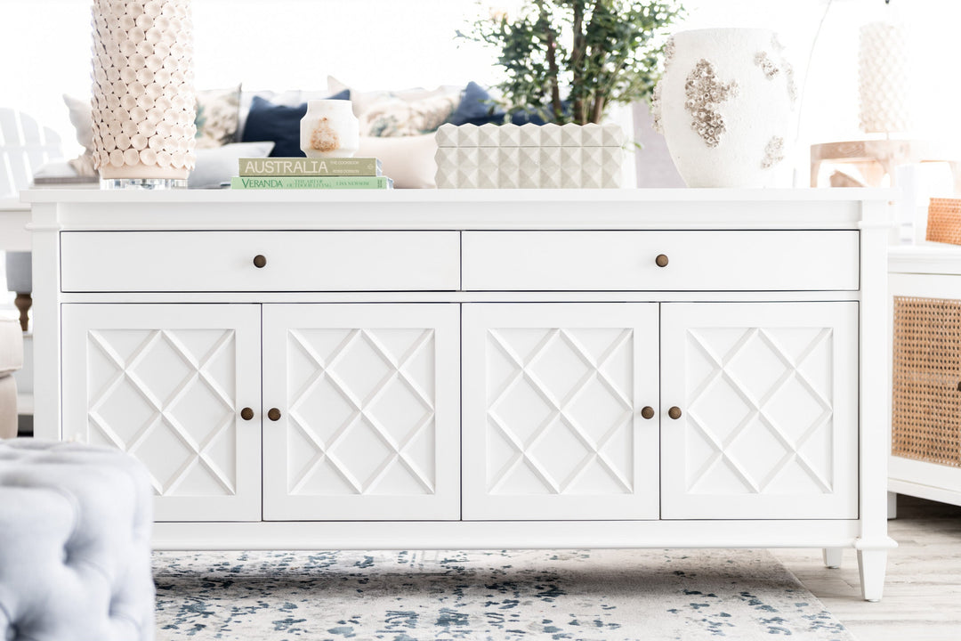Our 'Ascot' buffet features stunning geometric fretwork detailing. This signature fretwork diagonal diamond design on the drawers and doors, creating a beautiful yet understated statement. The fretwork detailing is offset by its classic profile and simple brass knobs. This range is versatile enough to suit any home, whether it’s classic Hamptons, modern Hamptons, or even a contemporary space. The buffet offers ample storage with 2 drawers and cupboards.It can be used as a buffet, entrance console or drinks cabinet.