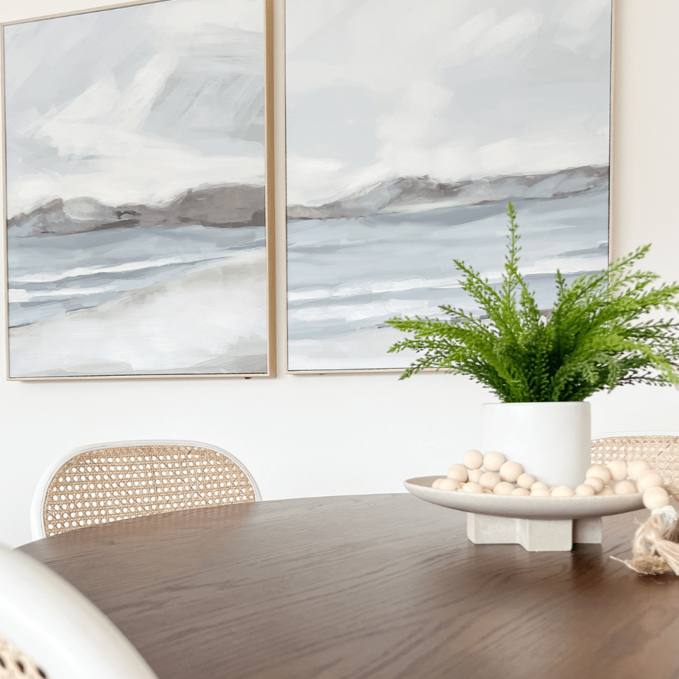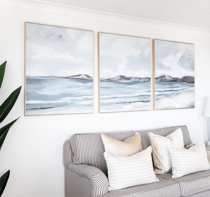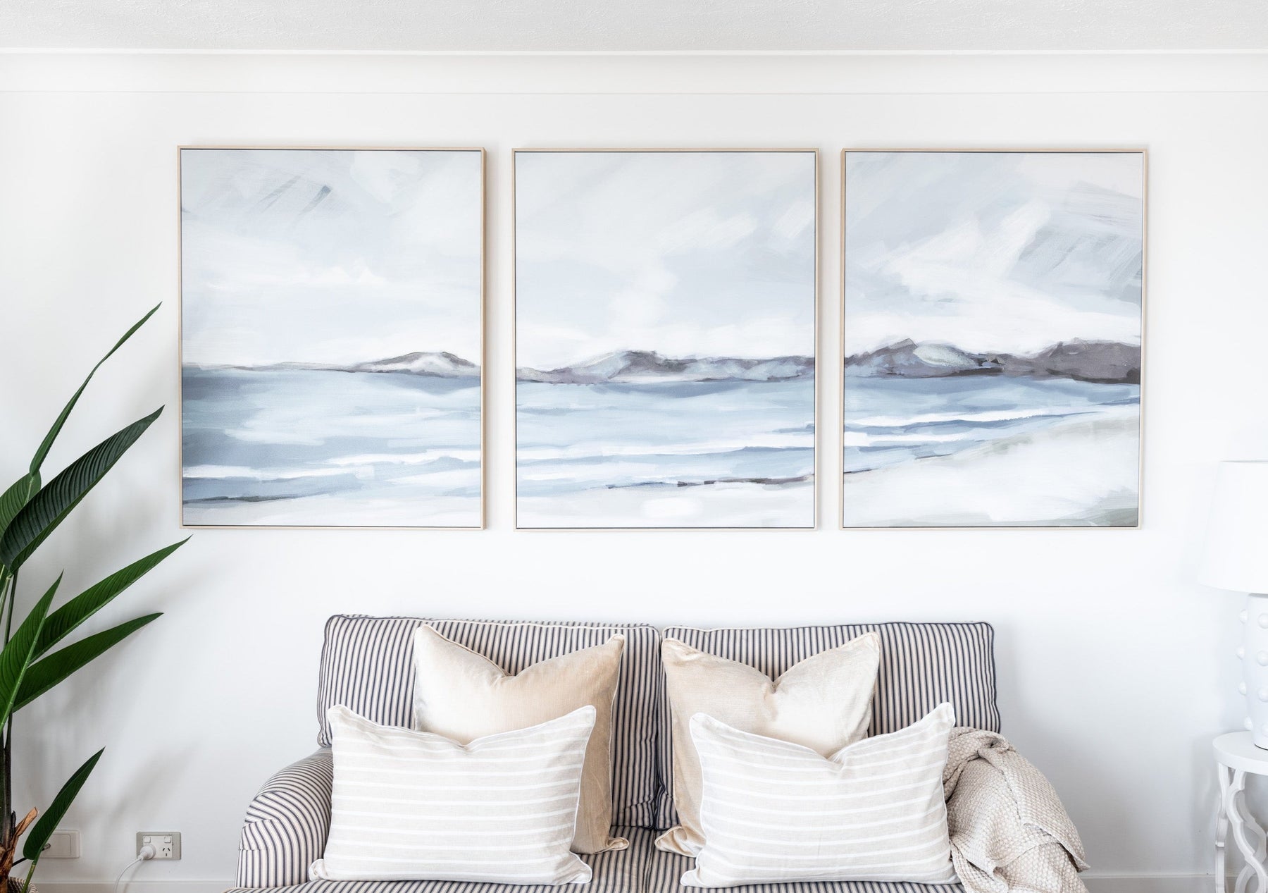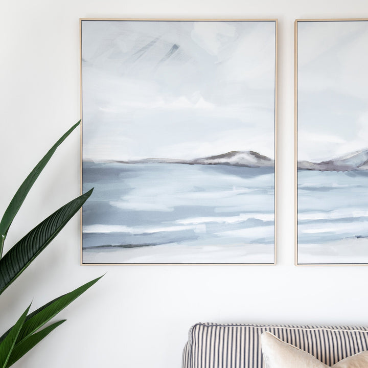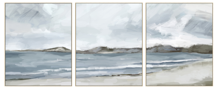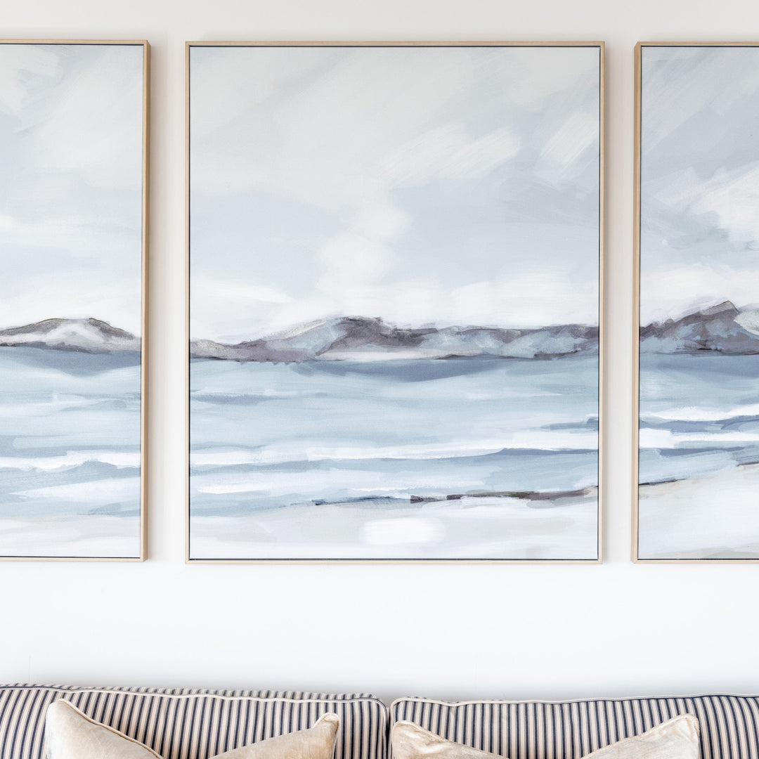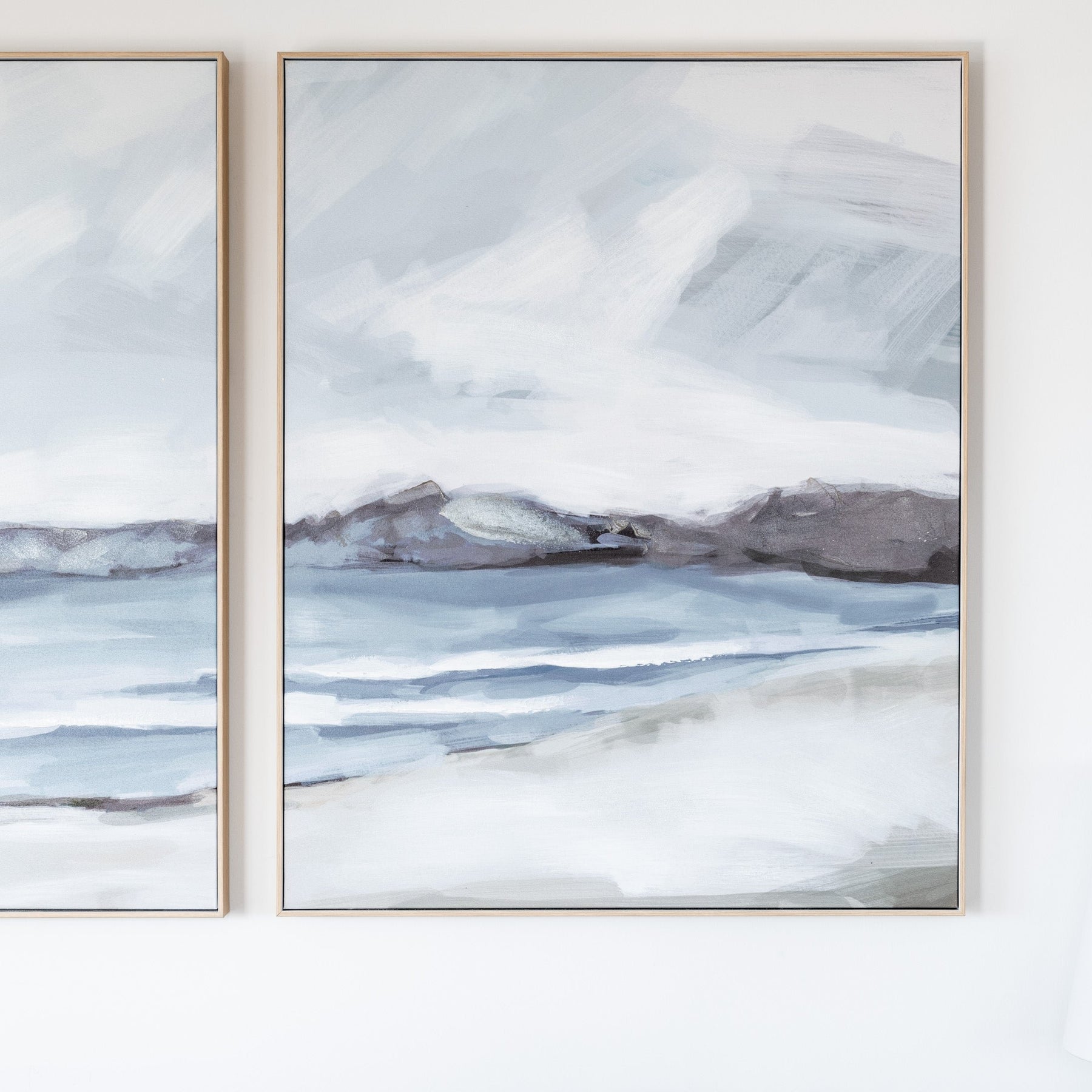 Our 'Beachside Stroll' canvas is a gorgeous beachside view of the ocean featuring hues of blue and natural tones.