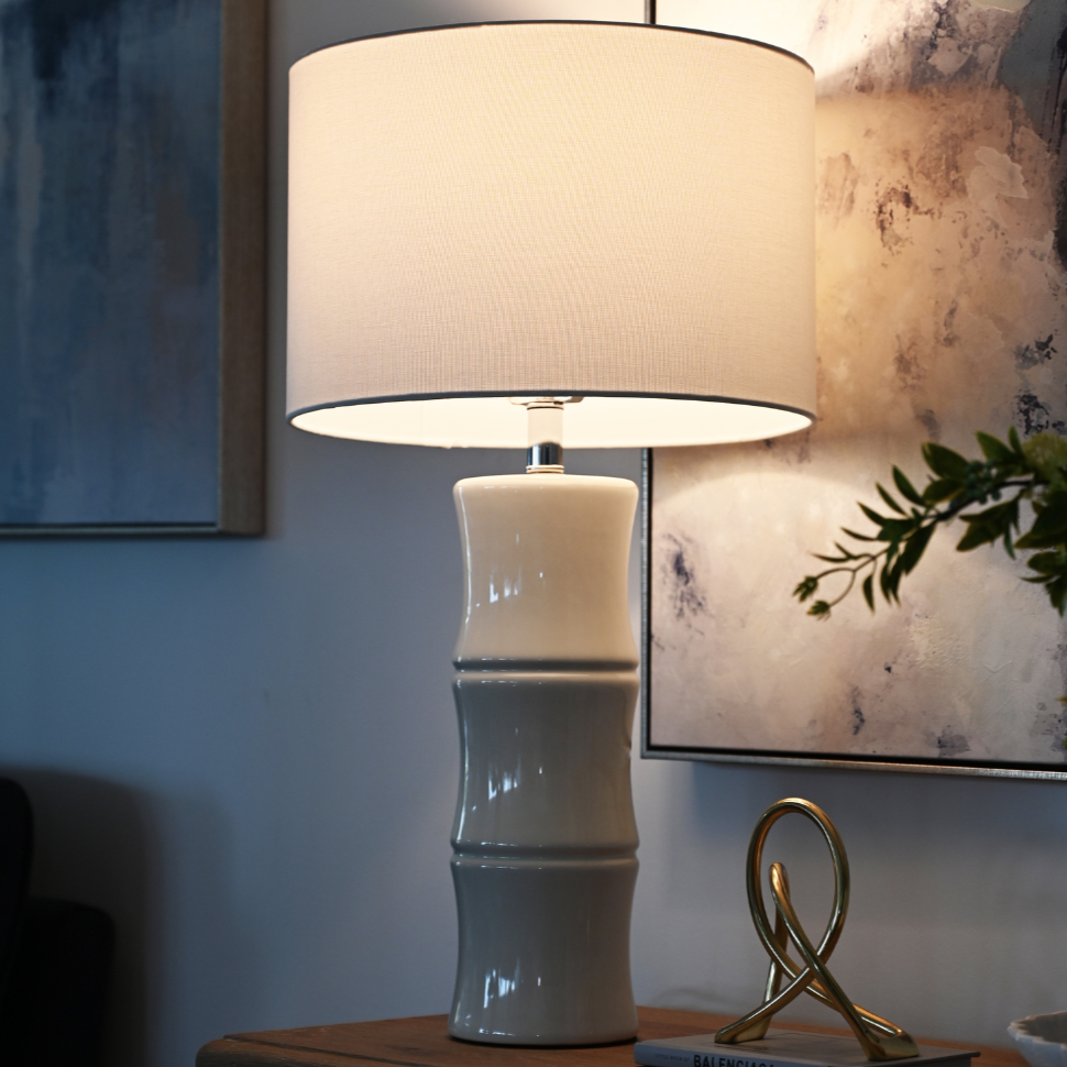 Bring a modern style to your home with the 'Erica' ceramic table lamp. The white ceramic body has a bamboo shape. This ceramic lamp is perfect for adding an elegant touch and unique charm to your décor.