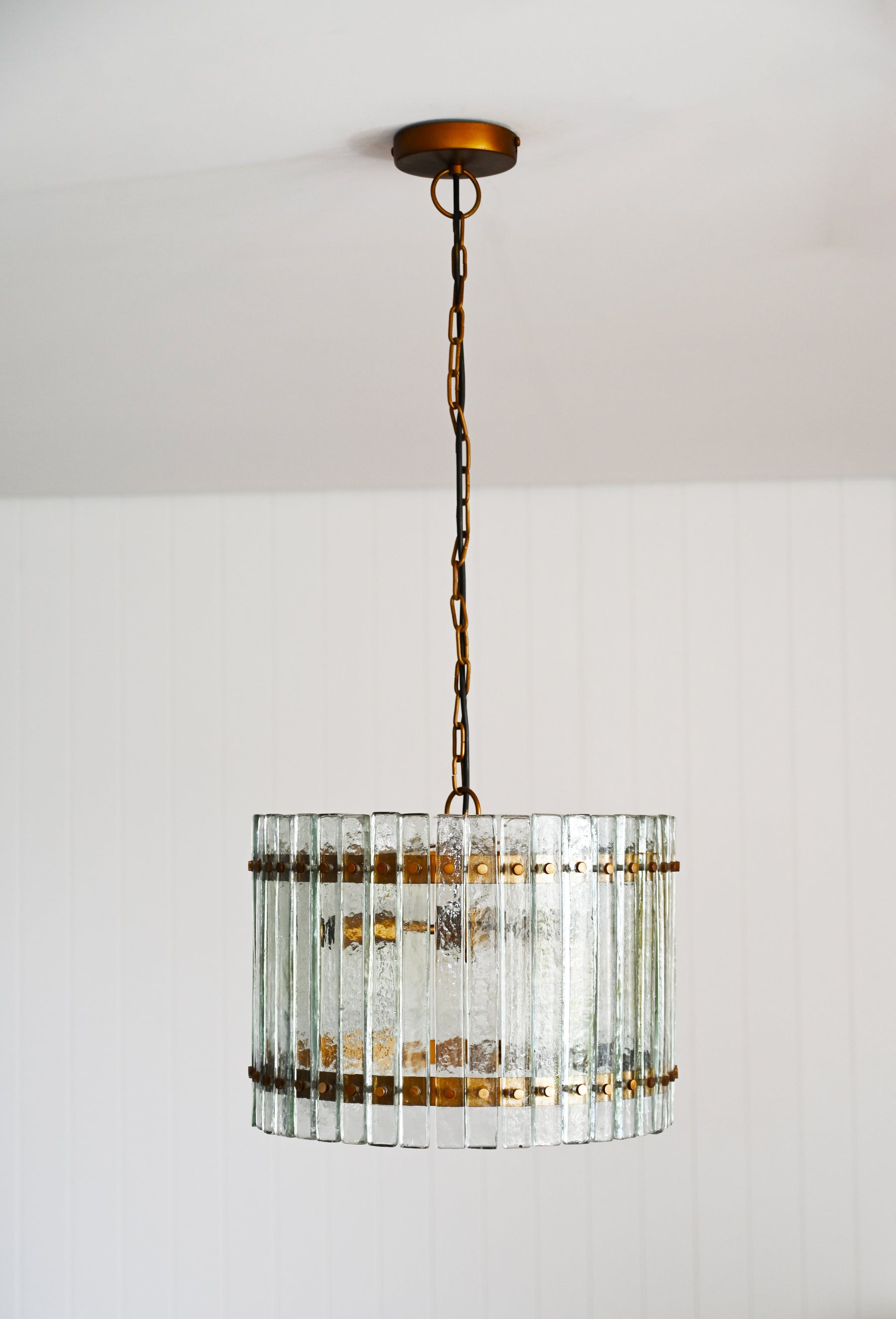 The 'Evie' Casted Glass Chandelier, a stunning blend of iron and casted glass. This elegant chandelier effortlessly combines timeless allure with modern sophistication. Elevate your space with the warm tones of antique brass and the graceful charm of casted glass, creating a captivating focal point for any room.
