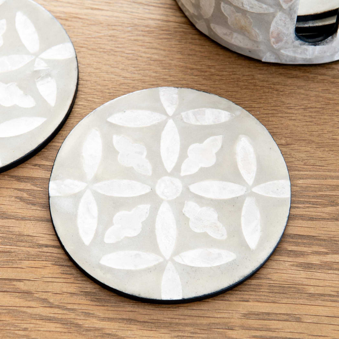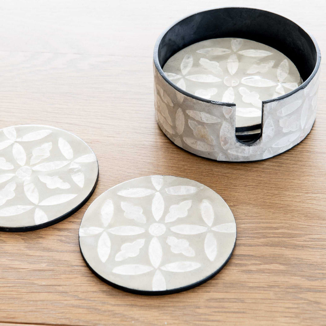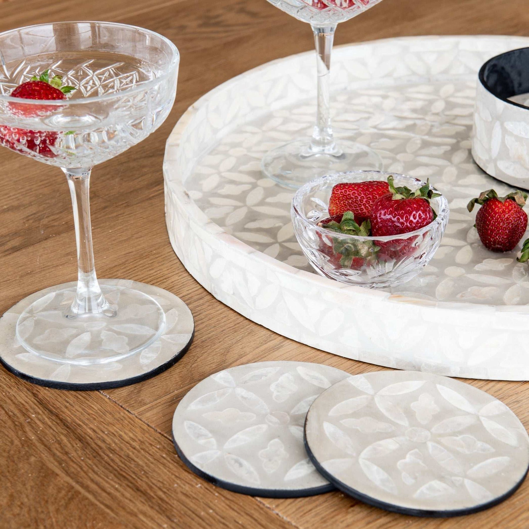 Elevate your tableware style with our beautiful Mother of Pearl collection, featuring our gorgeous floral coasters set. Pair them with the matching tray for a complete Hamptons inspired look.