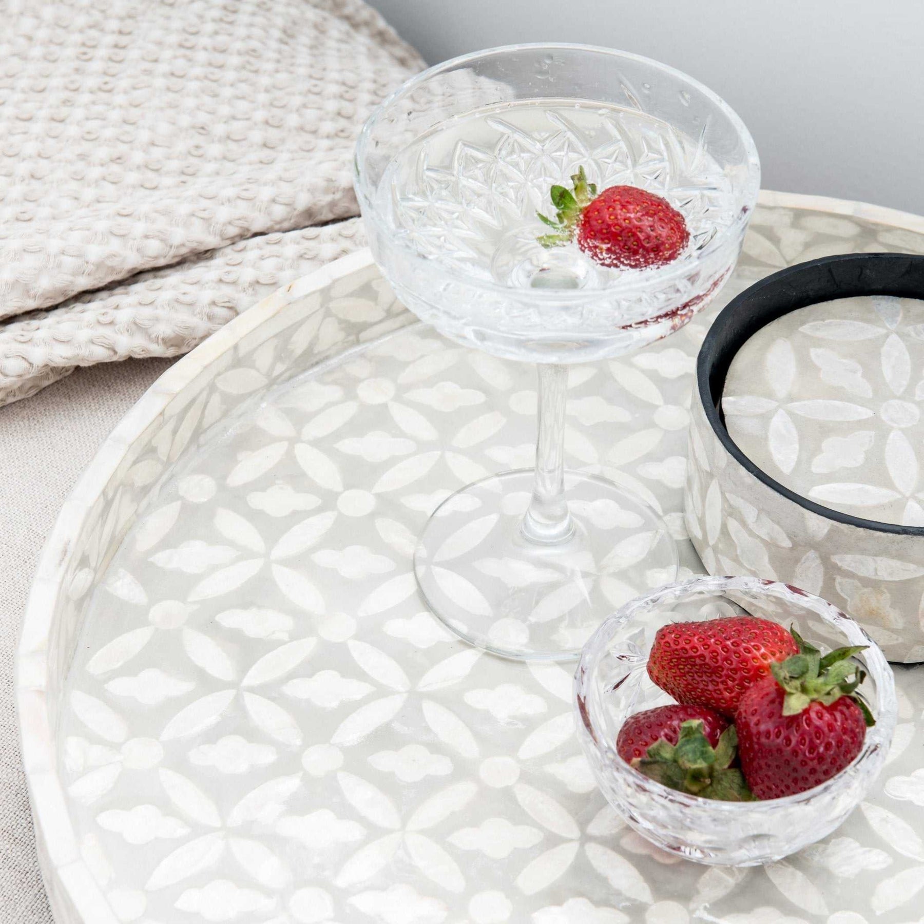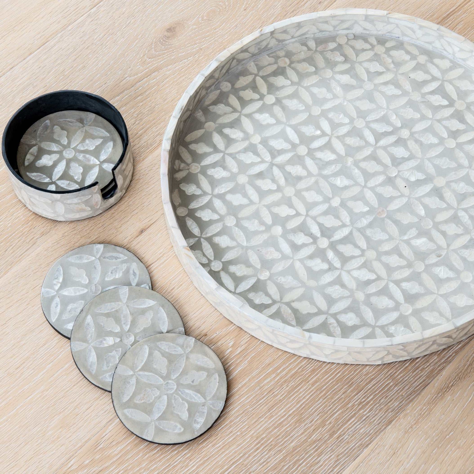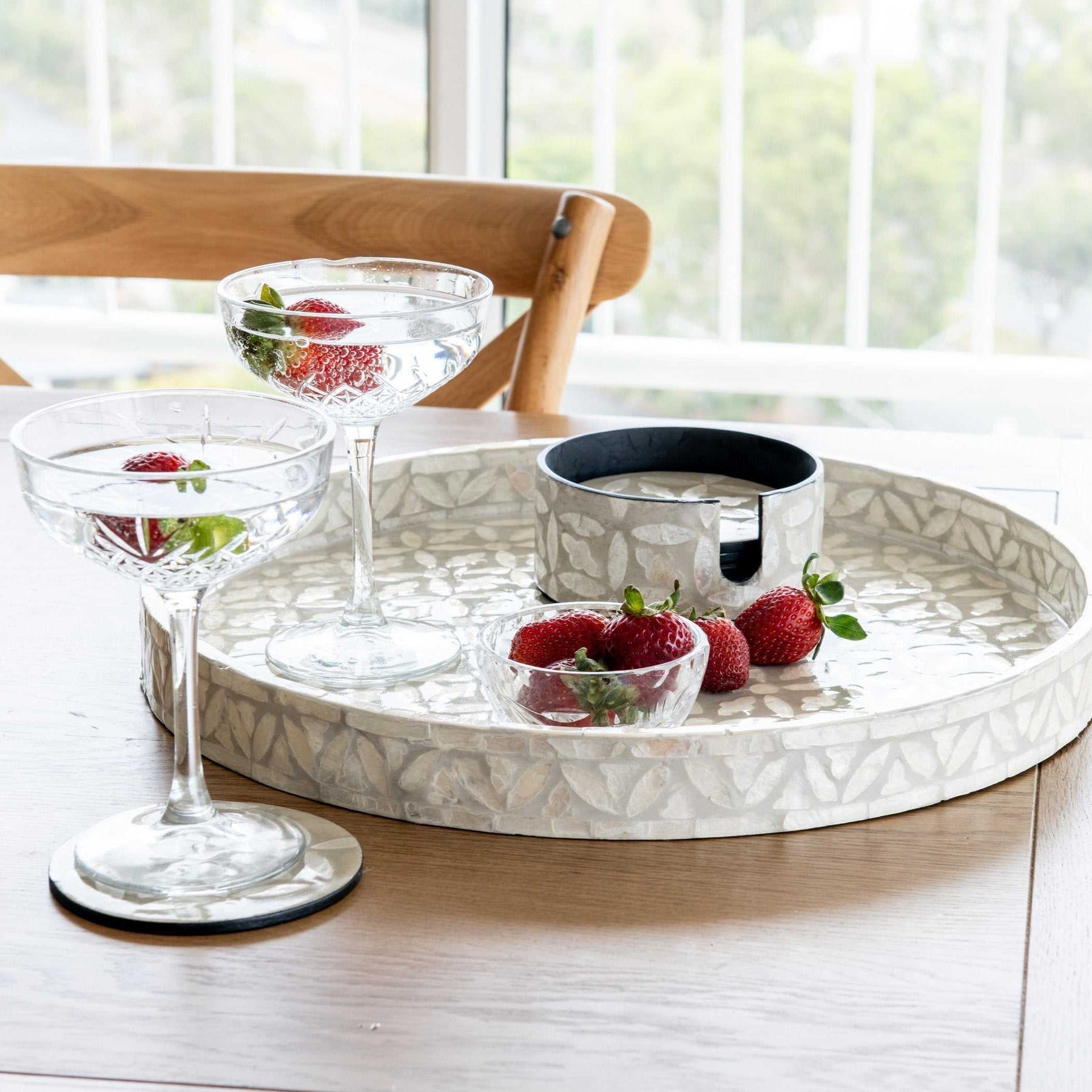 Elevate your tableware style with our beautiful Mother of Pearl collection, featuring our gorgeous floral coasters set. Pair them with the matching tray for a complete Hamptons inspired look.