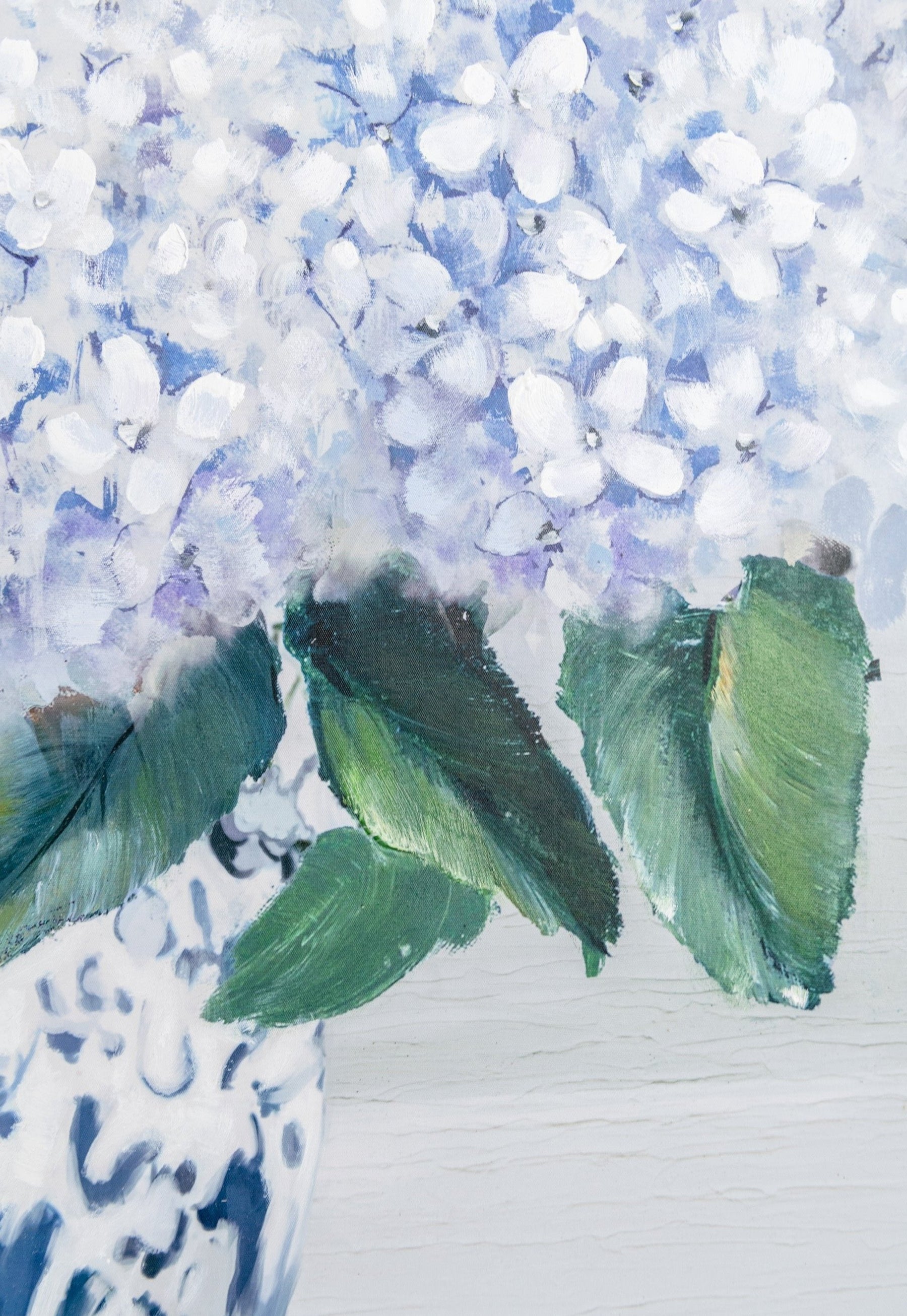 Our 'Ginger Jar Vase' canvas is a gorgeous piece of art. A landscape format piece, it represents a beautiful bunch of blue hydrangeas in a ginger jar. The soft hues of this painting are stunning and it is very textured. Set in an antique silver frame, this canvas will be sure to be a feature statement piece in your home.