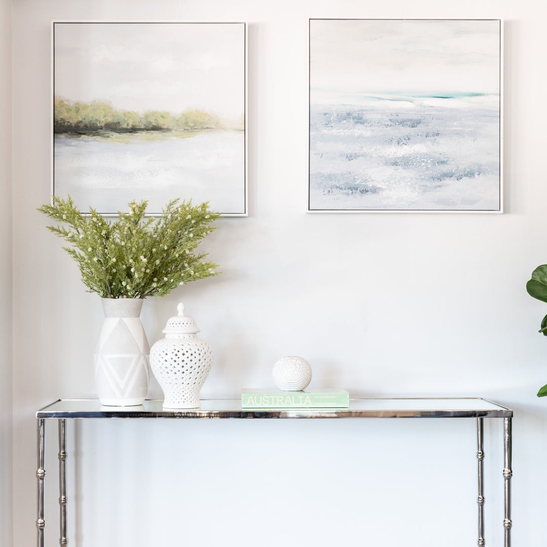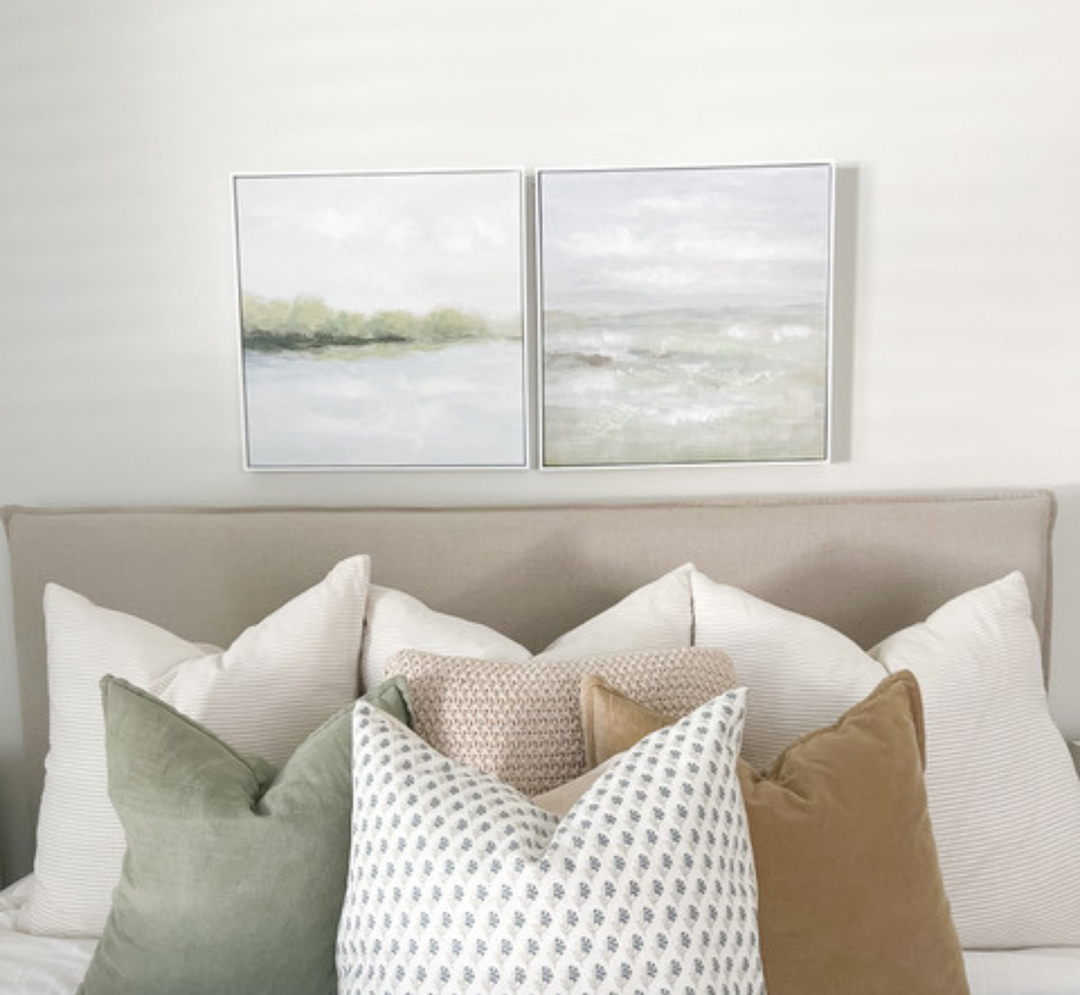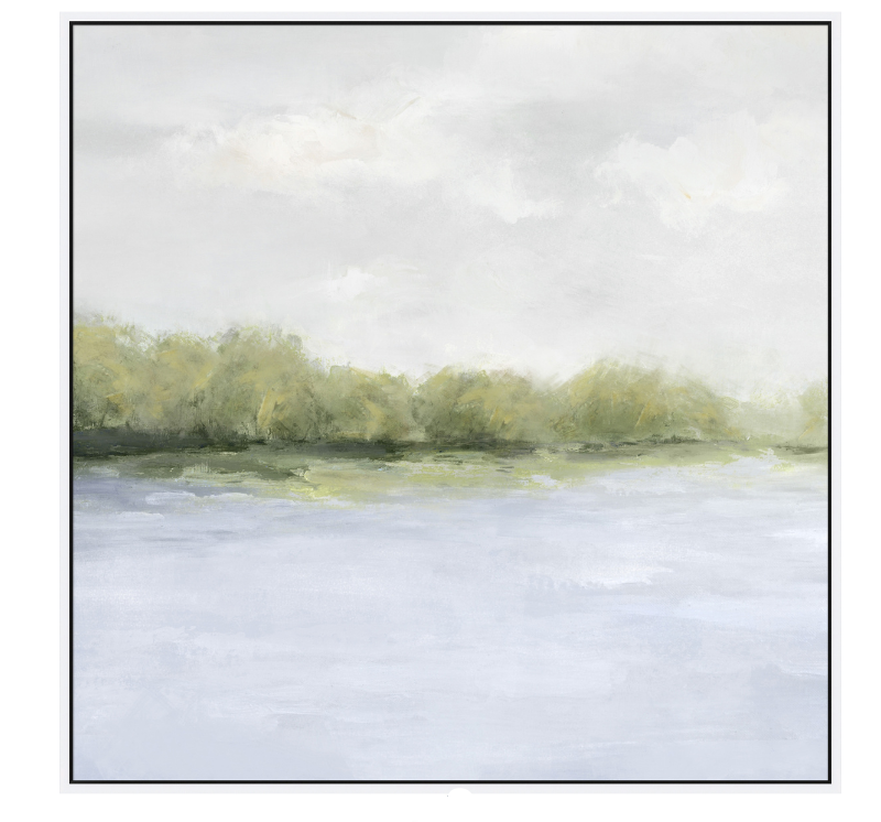 A handpainted abstract piece capturing a green landscape. . Use for styling on shelves anywhere in the home. Perfect for small spaces where a beautiful art is needed!