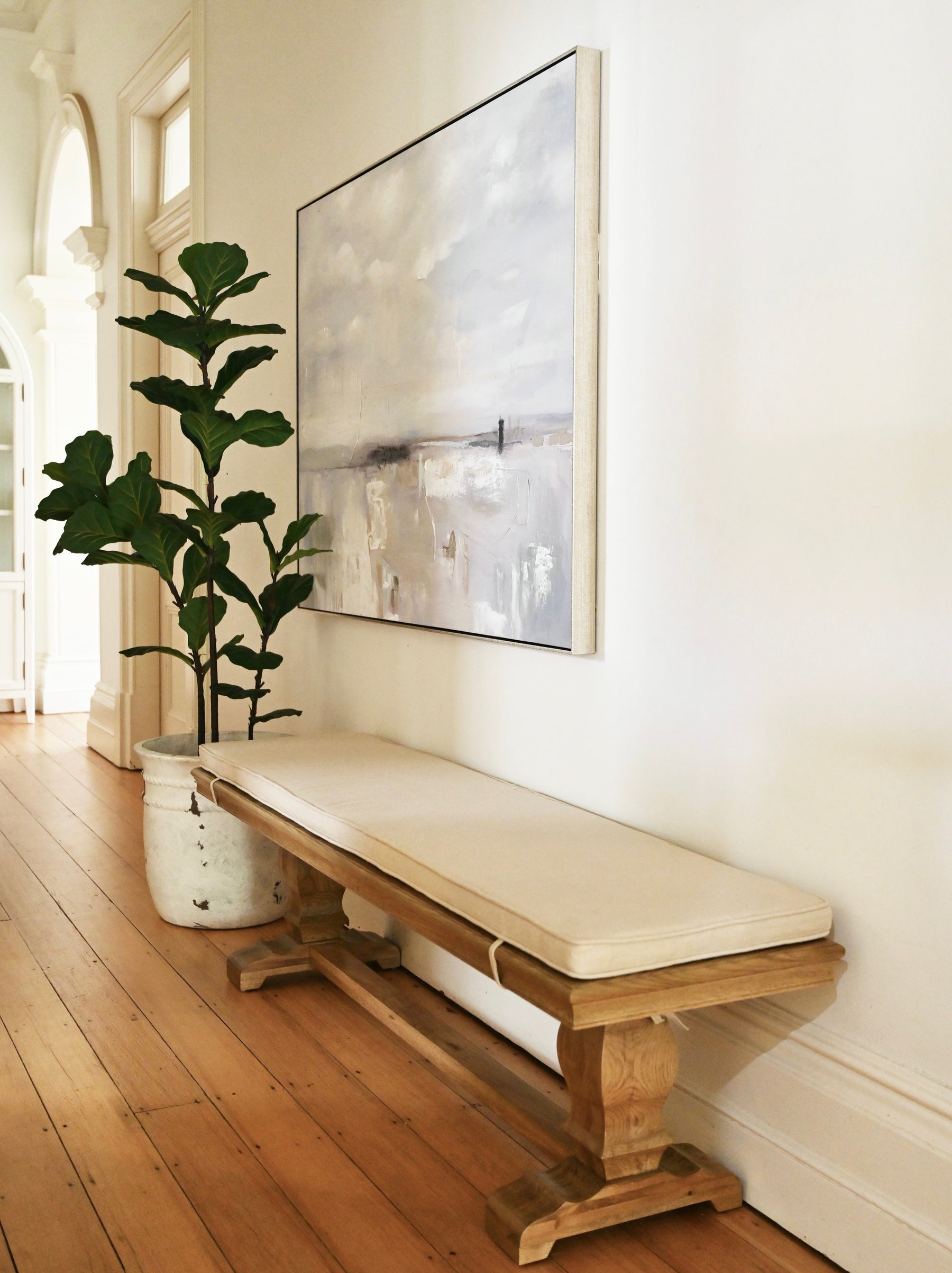 The Kensington Bench Seat perfectly matches our bestselling Kensington dining tables. Use in conjunction with your table or use as a bench seat in your entrance or hallway. Made from American oak, it features a padded linen cushion that sits on top of the bench and ties underneath. This cushion is fully removable for easy cleaning. The Kensington bench seat is the perfect piece to add charm and versatility to your space.