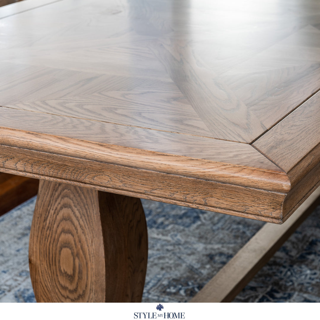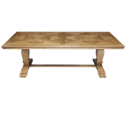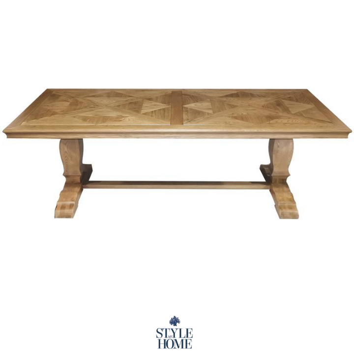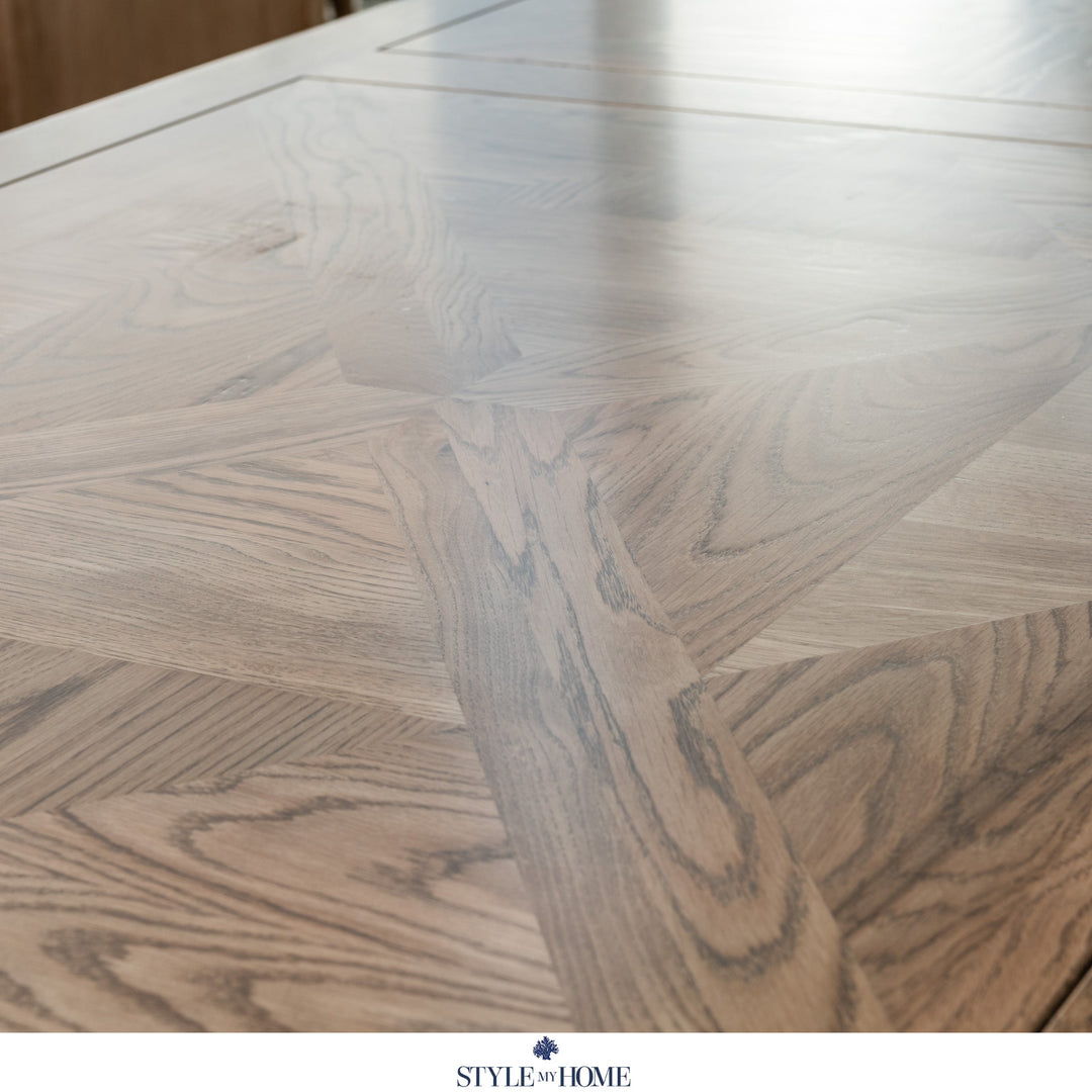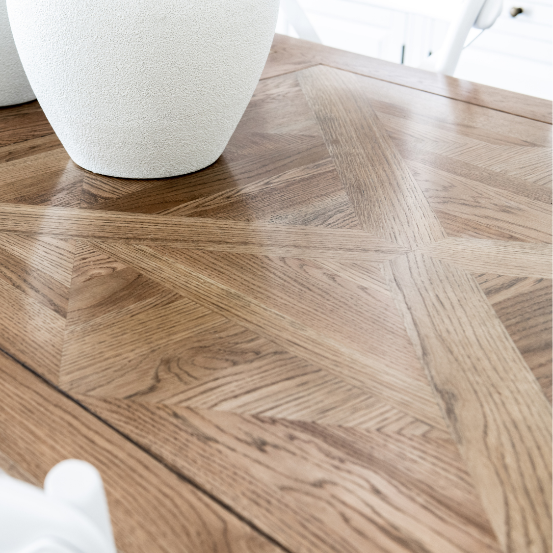 Our 'Kensington' natural oak parquet table is simply stunning. Handcrafted, it features a classic oak parquetry finish that will compliment any hamptons or coastal interior. The parquet table top is complimented by the carved legs which are very practical, providing stability and ensuring that all guests can be comfortably seated around the table. There is special detailing on the table top to add formality to this traditional style table.