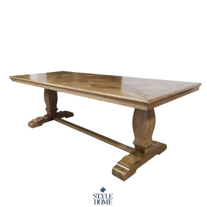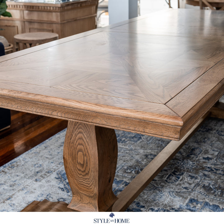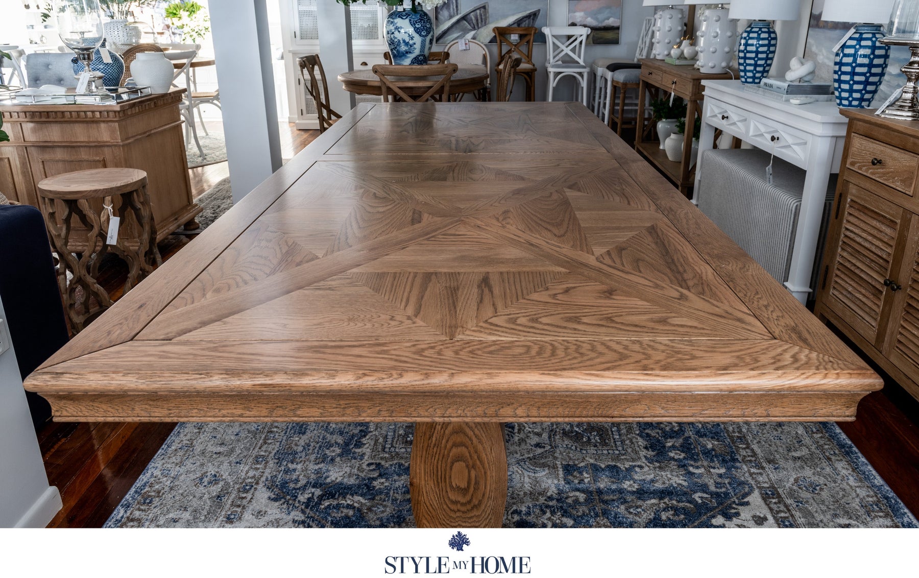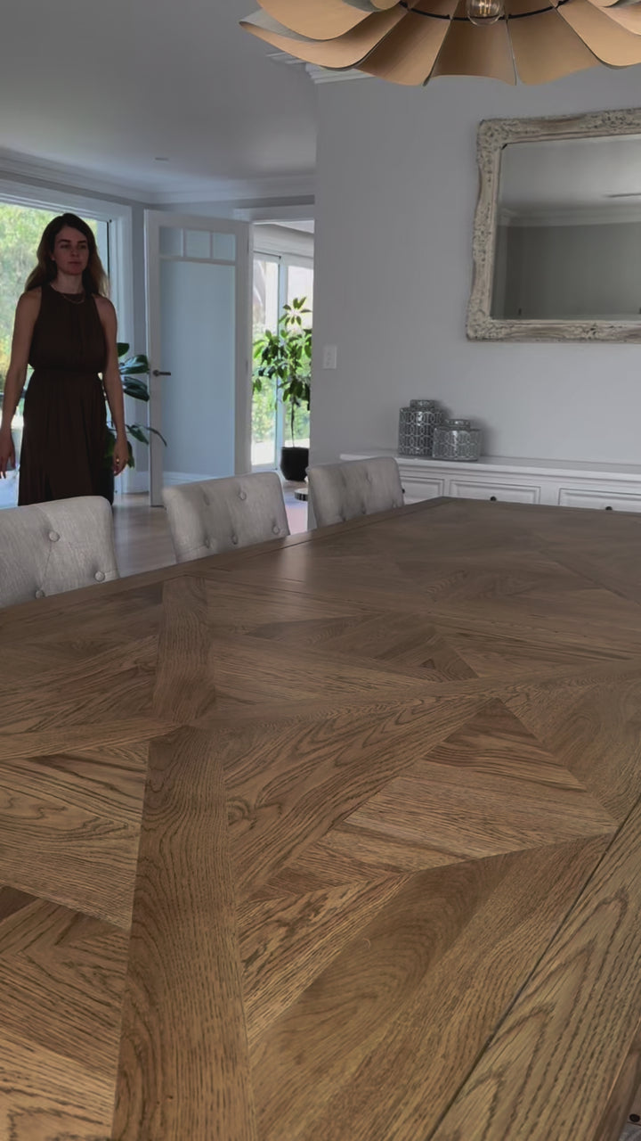 Our 'Kensington' natural oak parquet table is simply stunning. Handcrafted, it features a classic oak parquetry finish that will compliment any hamptons or coastal interior. The parquet table top is complimented by the carved legs which are very practical, providing stability and ensuring that all guests can be comfortably seated around the table. There is special detailing on the table top to add formality to this traditional style table.
