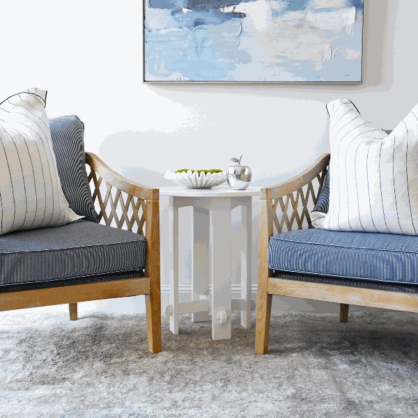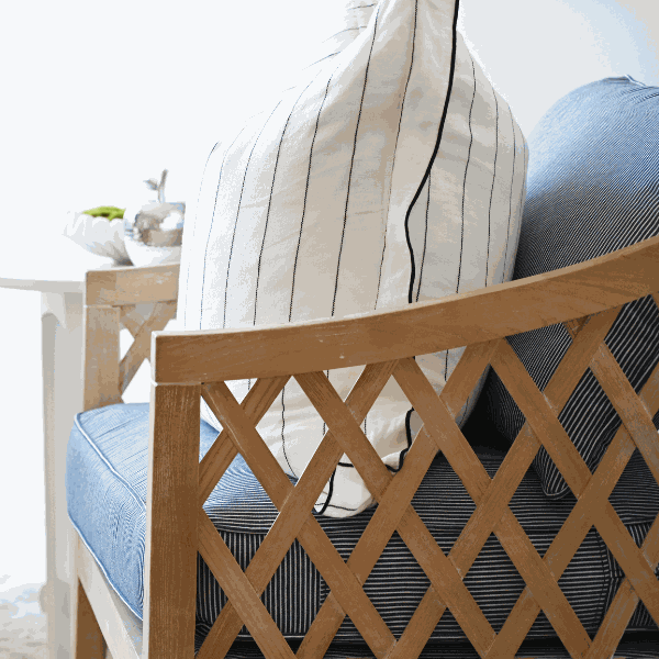 • Oak frame with either a oatmeal or navy/ white pin stripe cushion