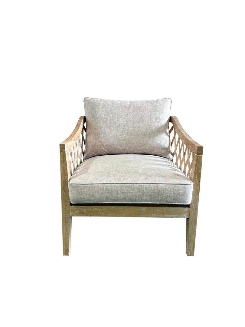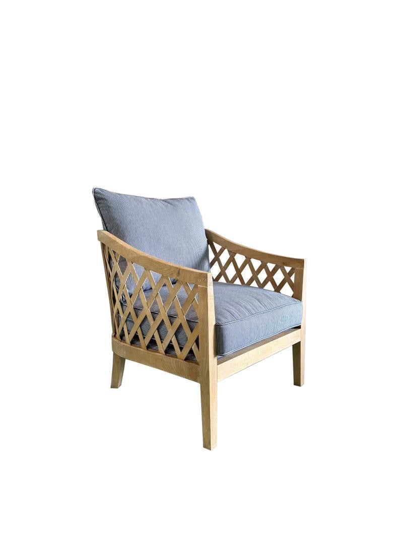 Adorn your living space with the exquisite Lattice Oak and Linen Armchair. Its elegant curves and intricate latticed frame add a touch of sophistication to any room. The armchair boasts 100% linen fabric upholstery, ensuring ultimate comfort and luxury. Designed with a traditional aesthetic, it effortlessly complements Hamptons, country, and traditional styled interiors. Perfect for living rooms, studies, and bedrooms.