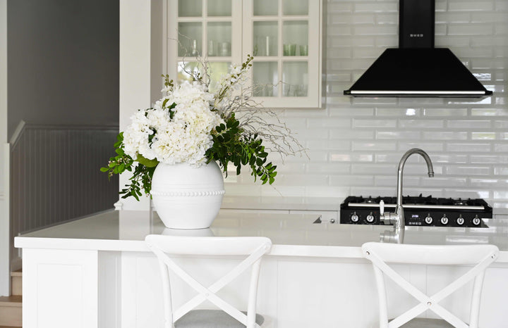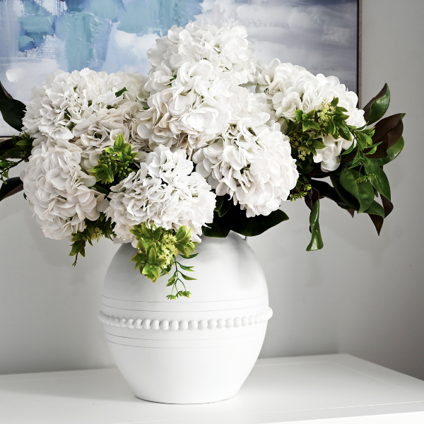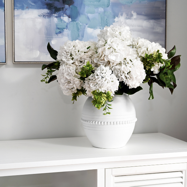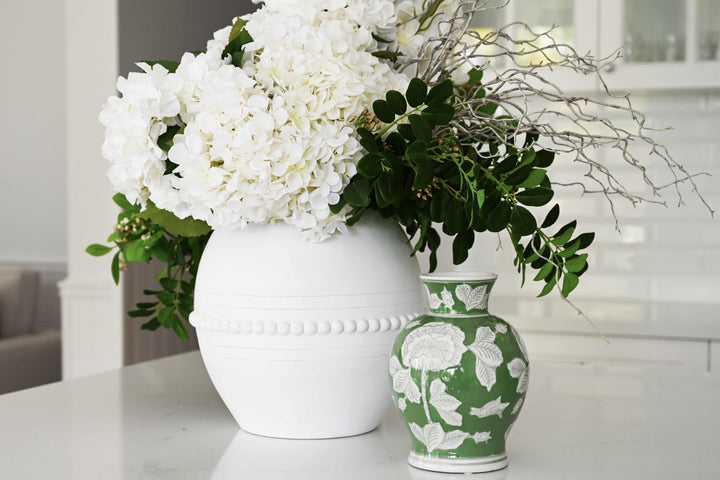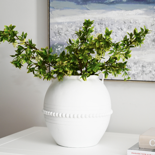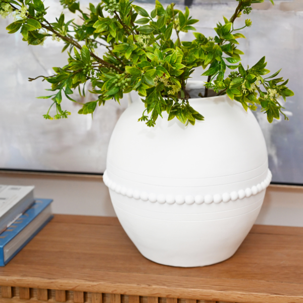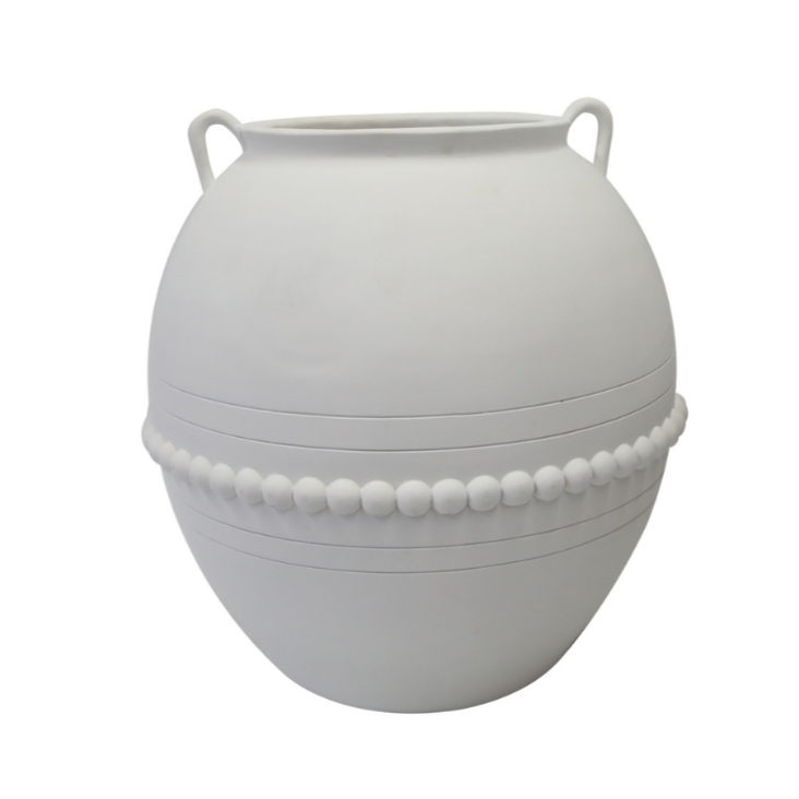 Constructed from poly resin, the 'Manor' Vase showcases a stunning design with elegant raised semi-spheres and intricate urn link handles. It can be utilised for flowers or preserved arrangements, or even as a standalone decorative piece.