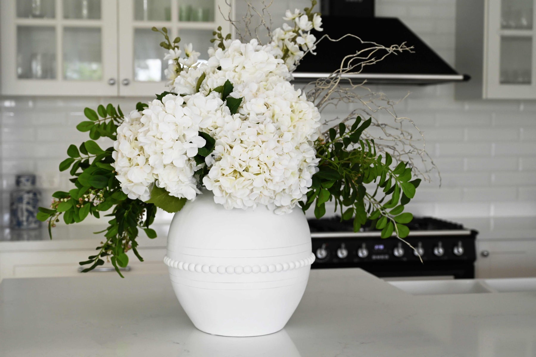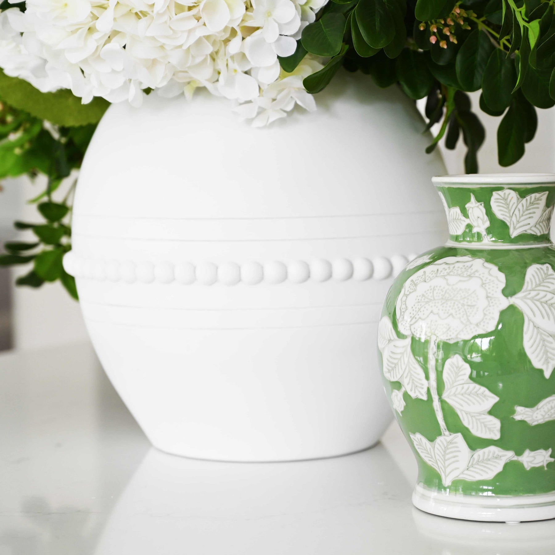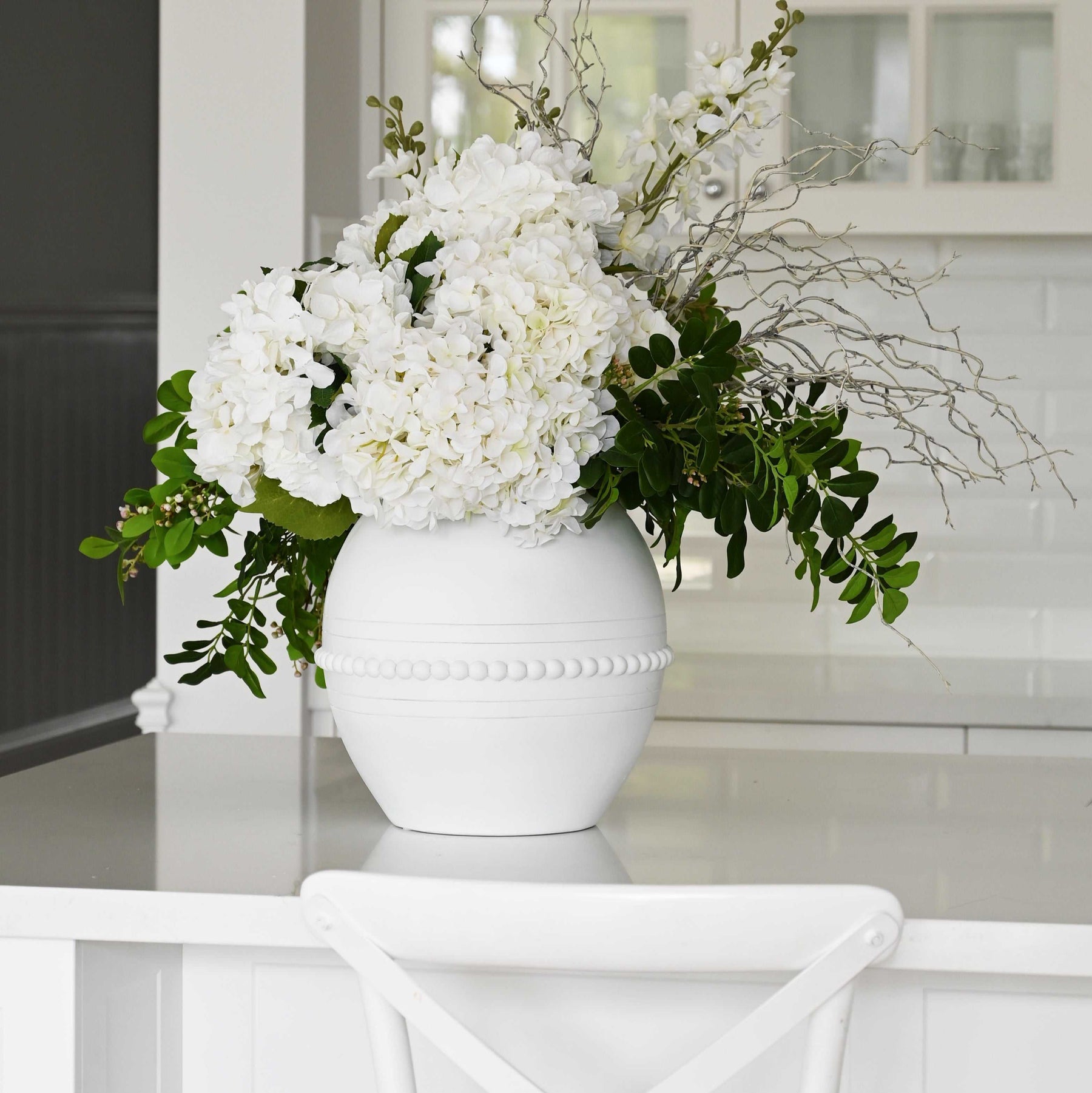 Constructed from poly resin, the 'Manor' Vase showcases a stunning design with elegant raised semi-spheres and intricate urn link handles. It can be utilised for flowers or preserved arrangements, or even as a standalone decorative piece.