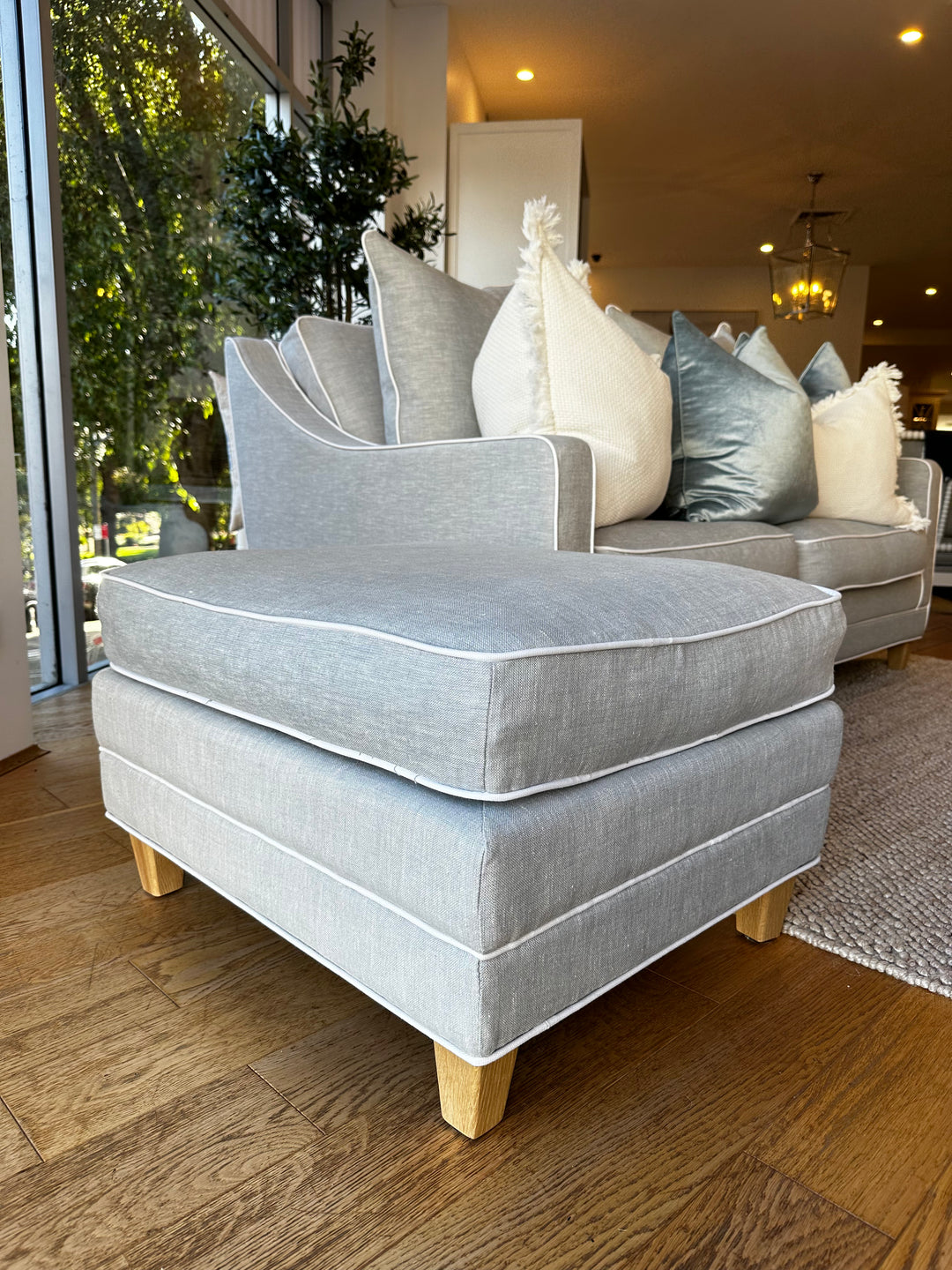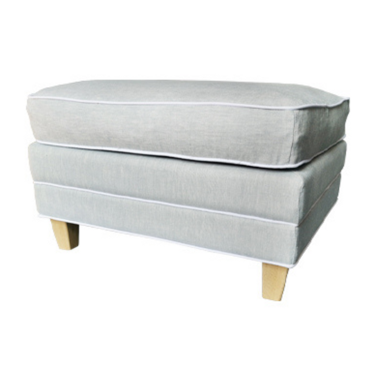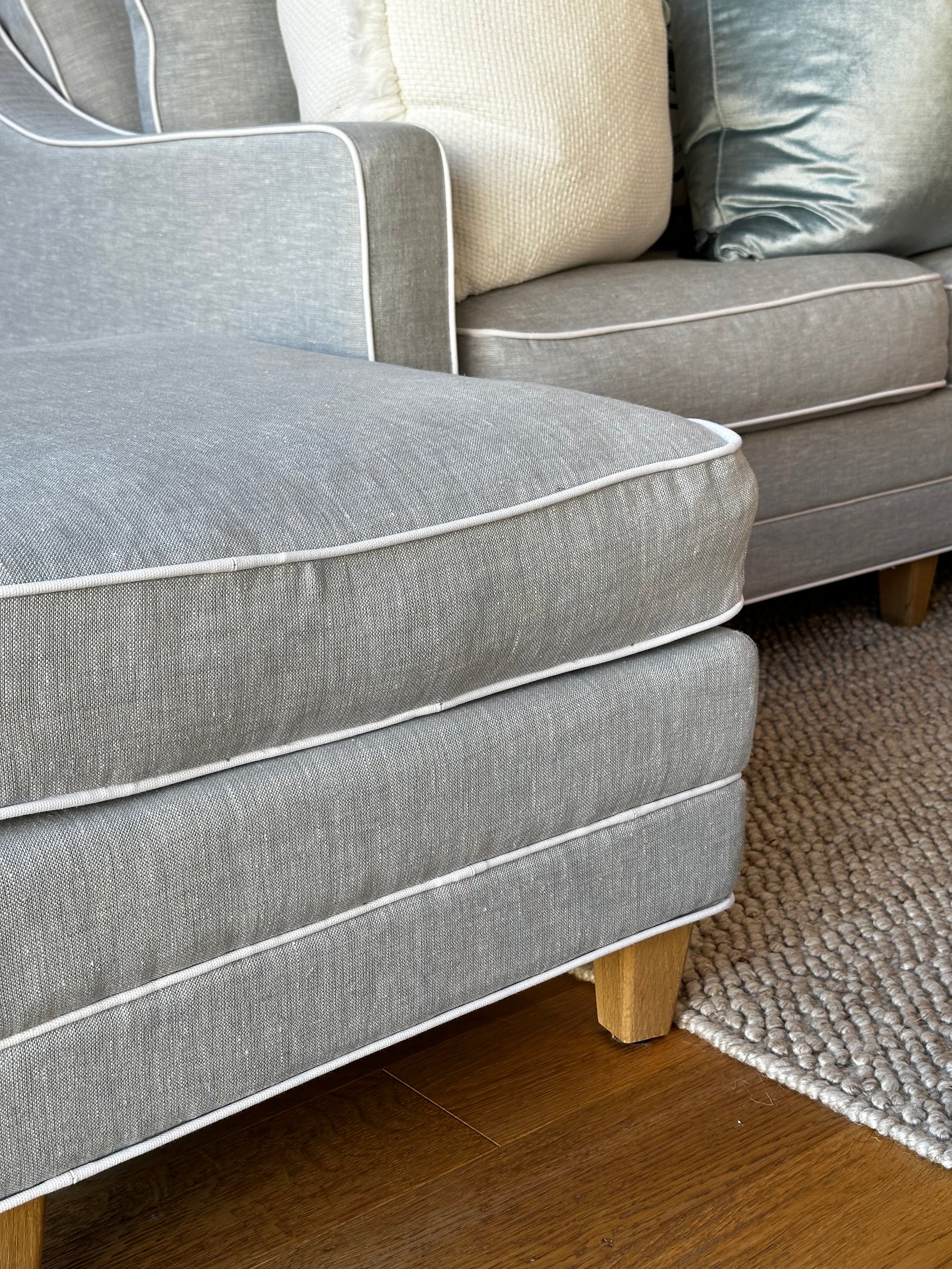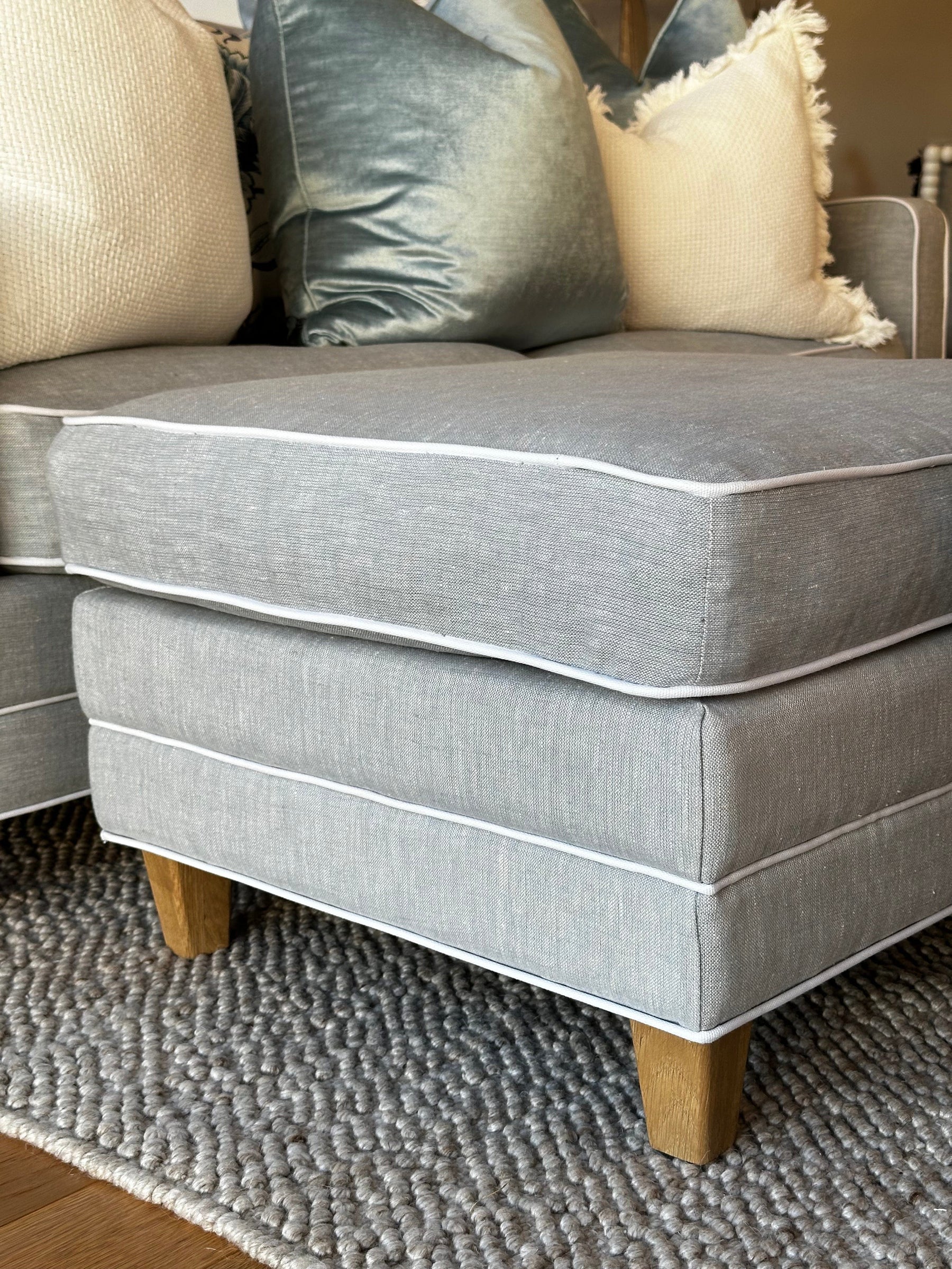 Our new ‘Martha’ ottoman lounge is the perfect choice whether your home is traditional or contemporary. This is upholstered in many of our signature 100% linen colours and finished off with striking white piping. This stunning sofa sits on gorgeous oak legs.