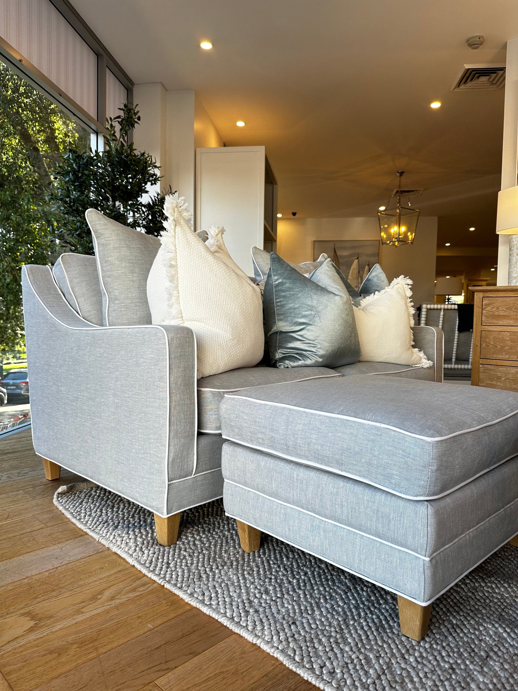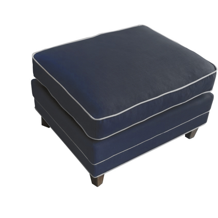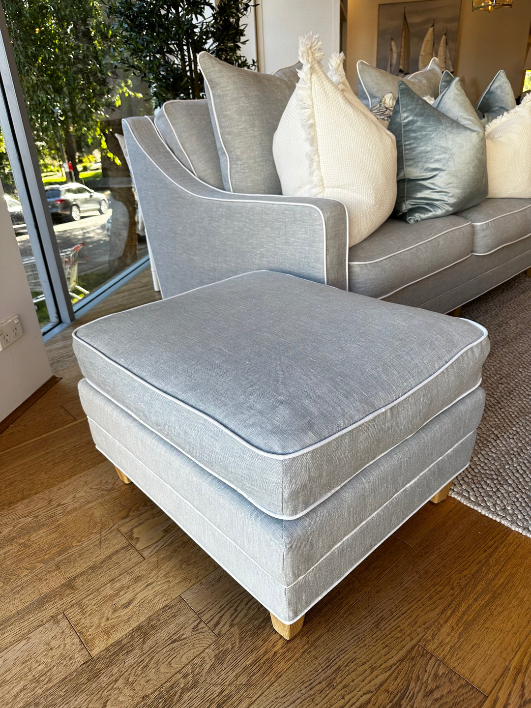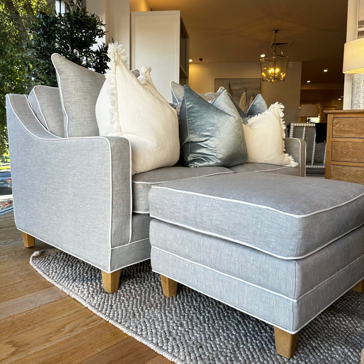 Our new ‘Martha’ ottoman lounge is the perfect choice whether your home is traditional or contemporary. This is upholstered in many of our signature 100% linen colours and finished off with striking white piping. This stunning sofa sits on gorgeous oak legs.