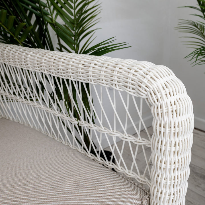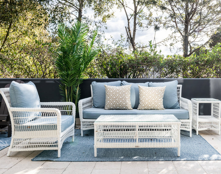 The ‘Oasis’ outdoor range is made from the polyethylene fibre, polyrod. It can withstand UV radiation, extreme heat, oxidation, high moisture mould and mildew. Because it is resistant to moisture, salt and chlorinated water, it is perfect for outdoor or beachside living.
