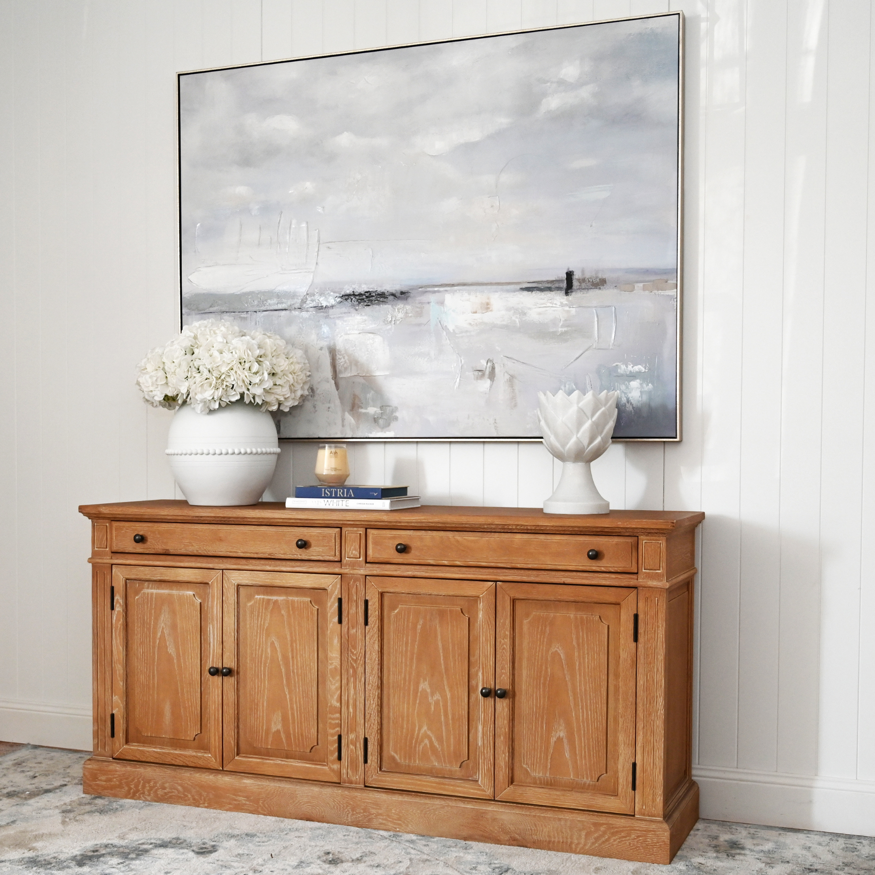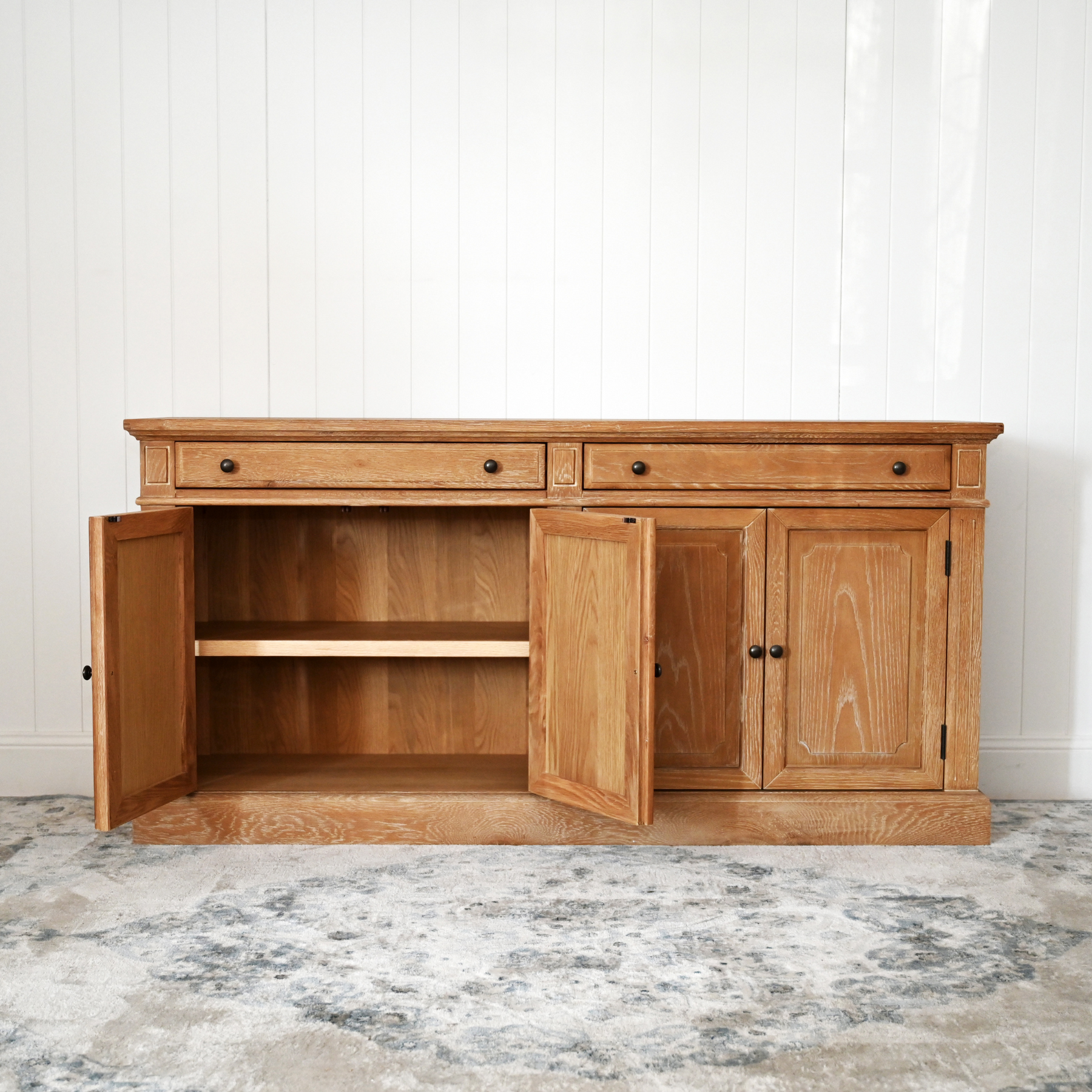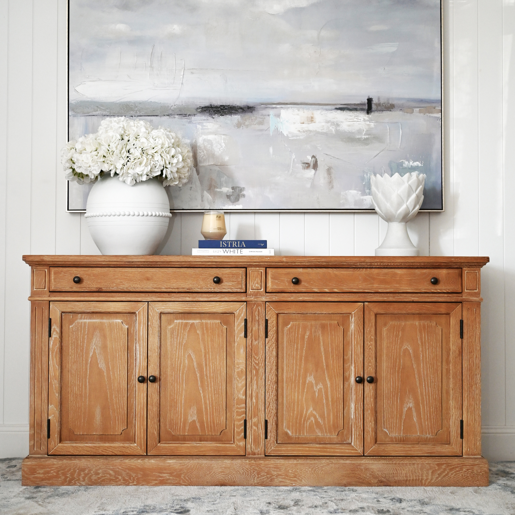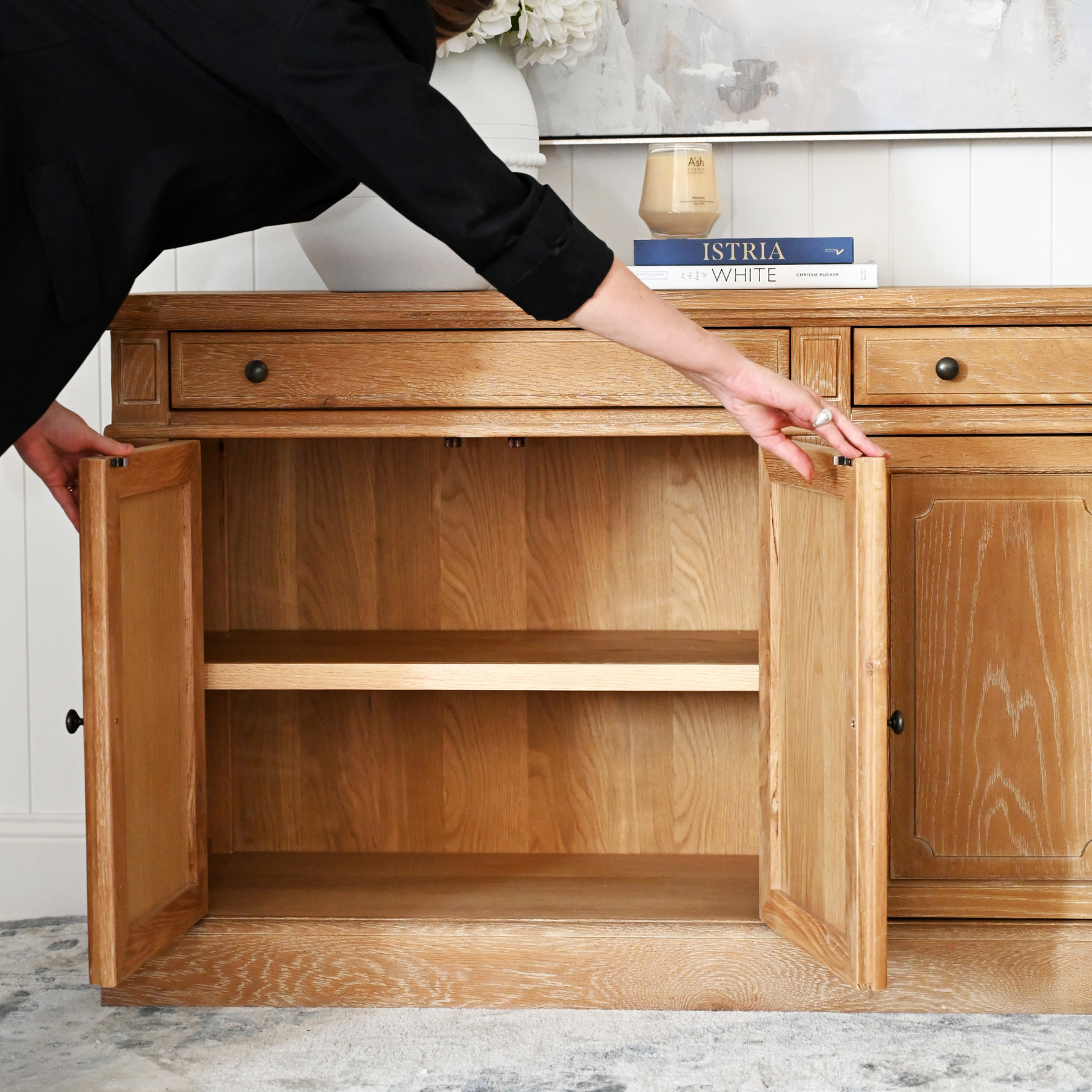 The Oxford Medium Buffet features a classic shaker-style design that complements a variety of home décors beyond just Hamptons interiors. Its timeless profile offers ample storage, including two cupboards with shelving and two large drawers. Designed for versatility, it works well as both a buffet and an entertainment unit. Available in satin white birch wood or whitewashed American oak, this piece balances durability with refined style.