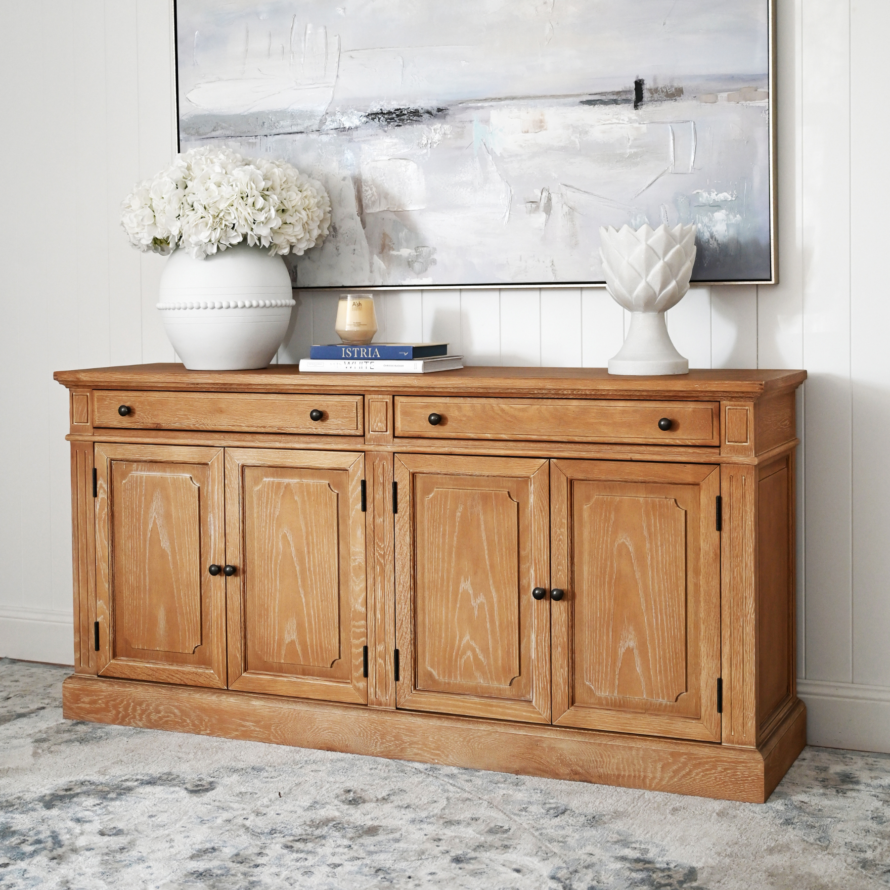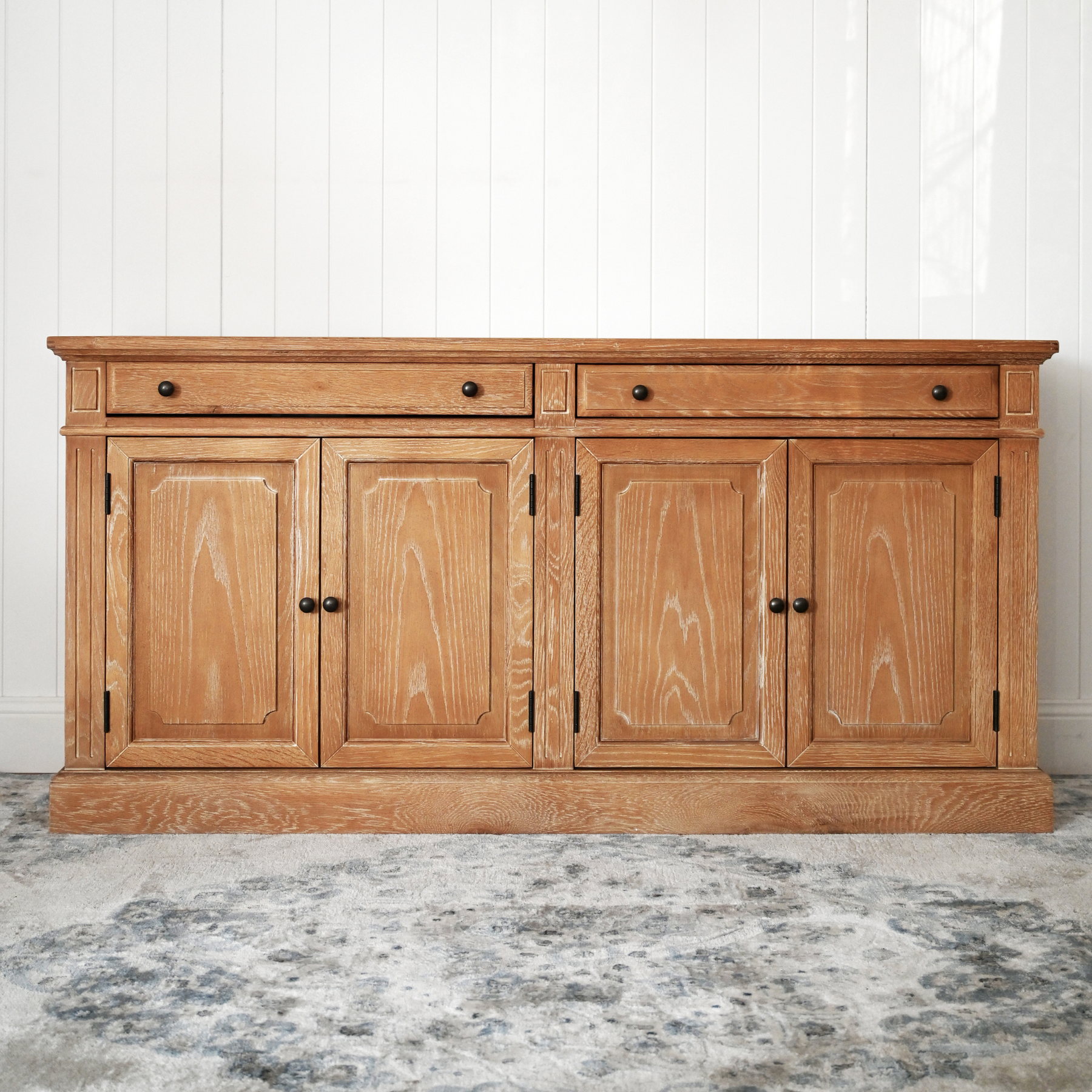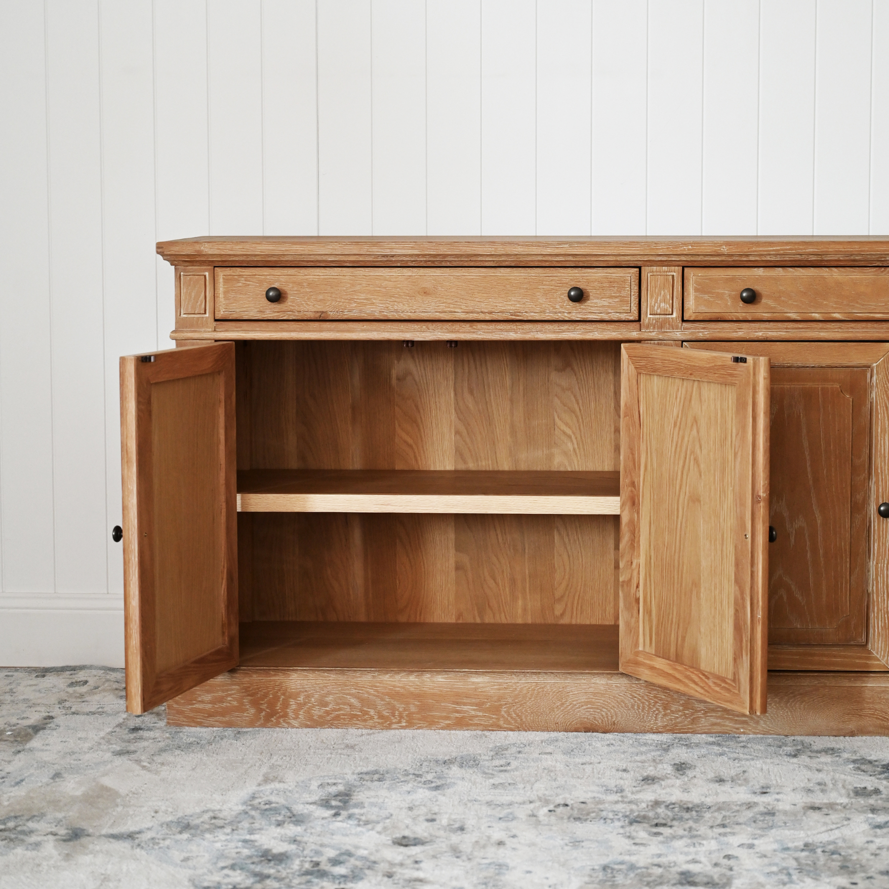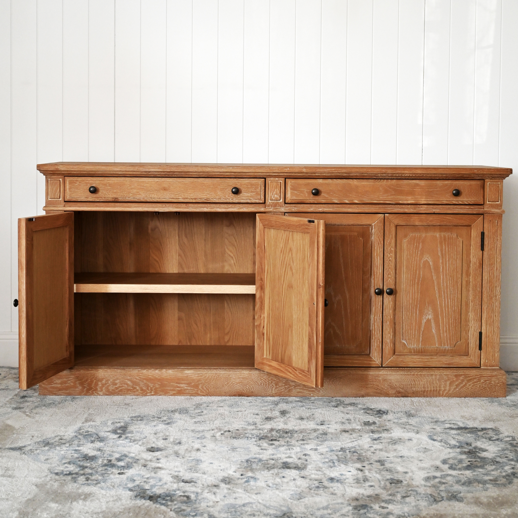 The Oxford Medium Buffet features a classic shaker-style design that complements a variety of home décors beyond just Hamptons interiors. Its timeless profile offers ample storage, including two cupboards with shelving and two large drawers. Designed for versatility, it works well as both a buffet and an entertainment unit. Available in satin white birch wood or whitewashed American oak, this piece balances durability with refined style.