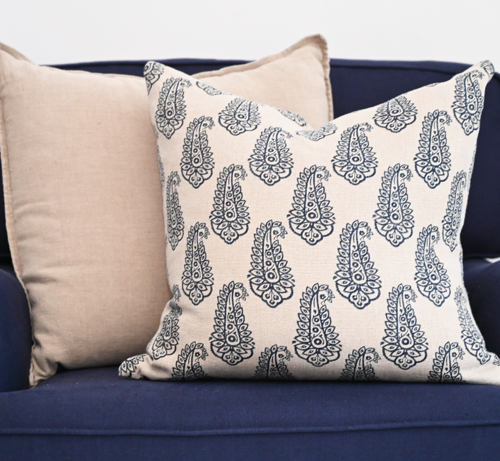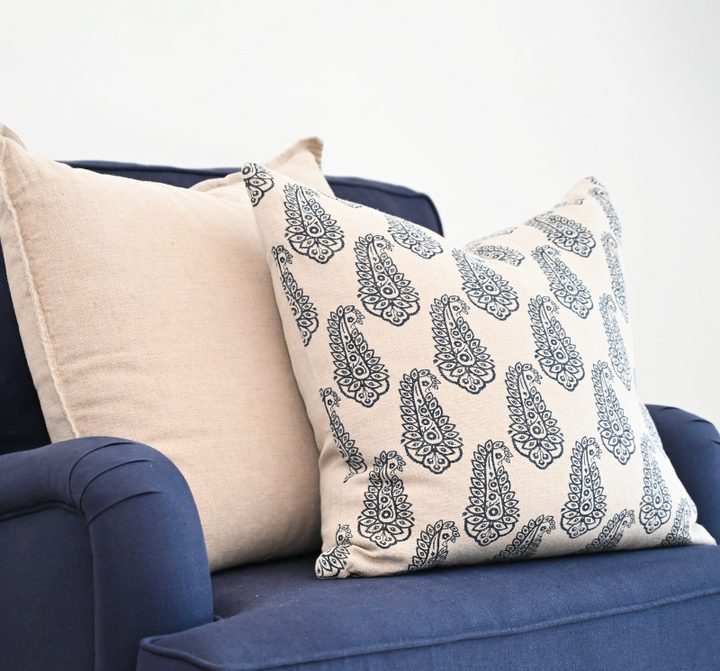 The 'Paisley' Linen Cushion is the perfect choice for a Hamptons inspired home. This is made using the block print technique on a beautiful oatmeal linen.