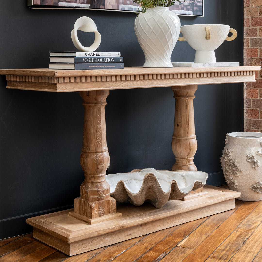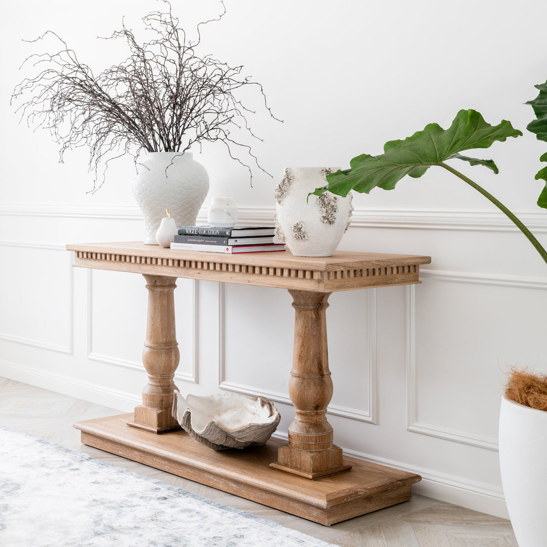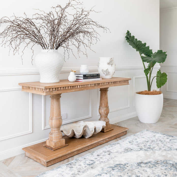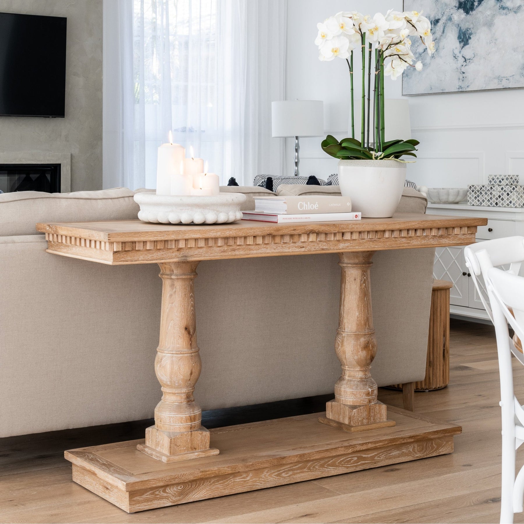 Make a statement in your space with the handcrafted Petra Medium Console Table, designed in a classic baluster style that adds organic and traditional charm and elegance to any room. With its detailed craftsmanship and oak finish, this piece effortlessly blends timeless design with versatile function—use it as a hallway console, sofa back table, or even a stylish TV stand.