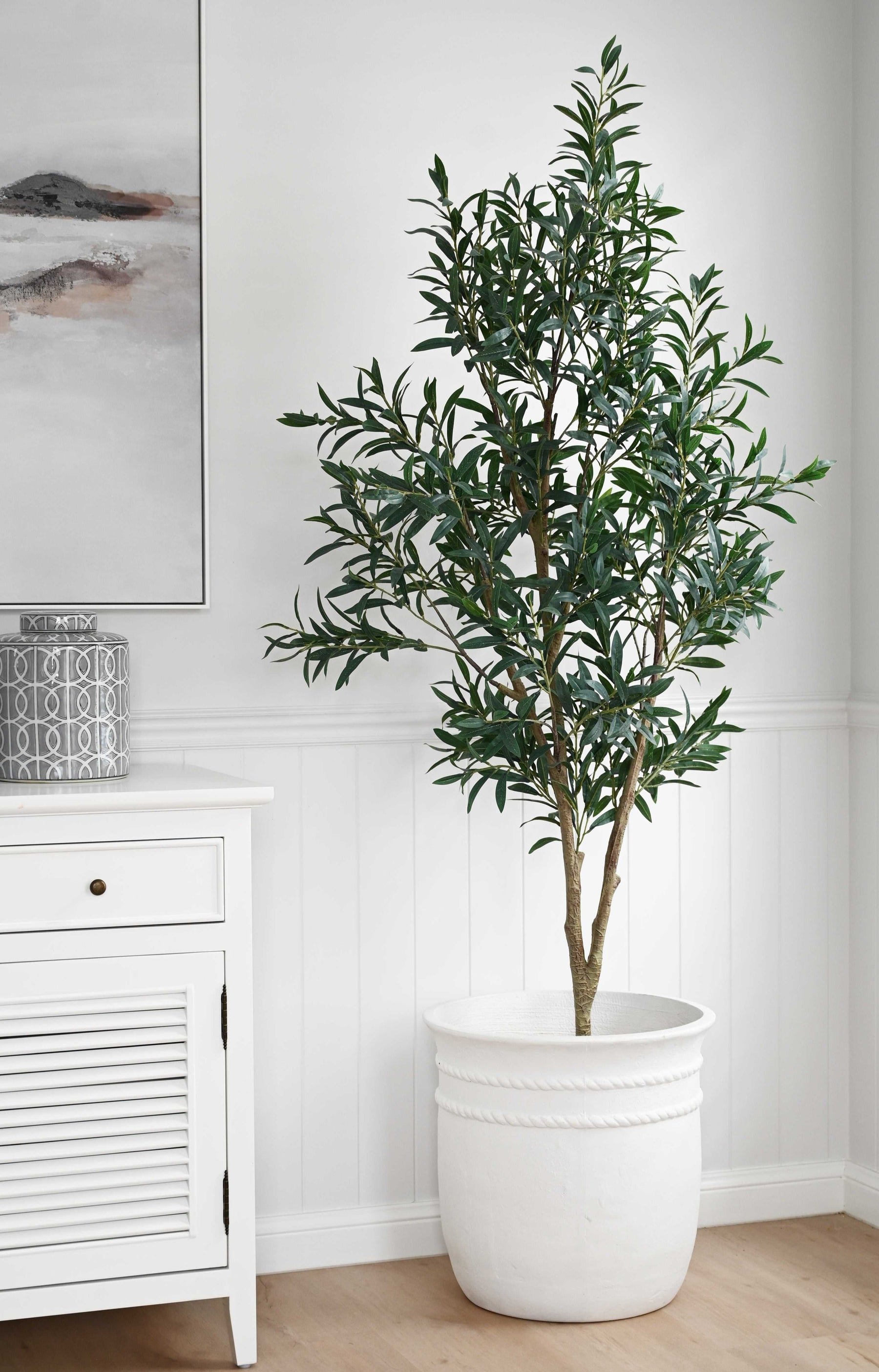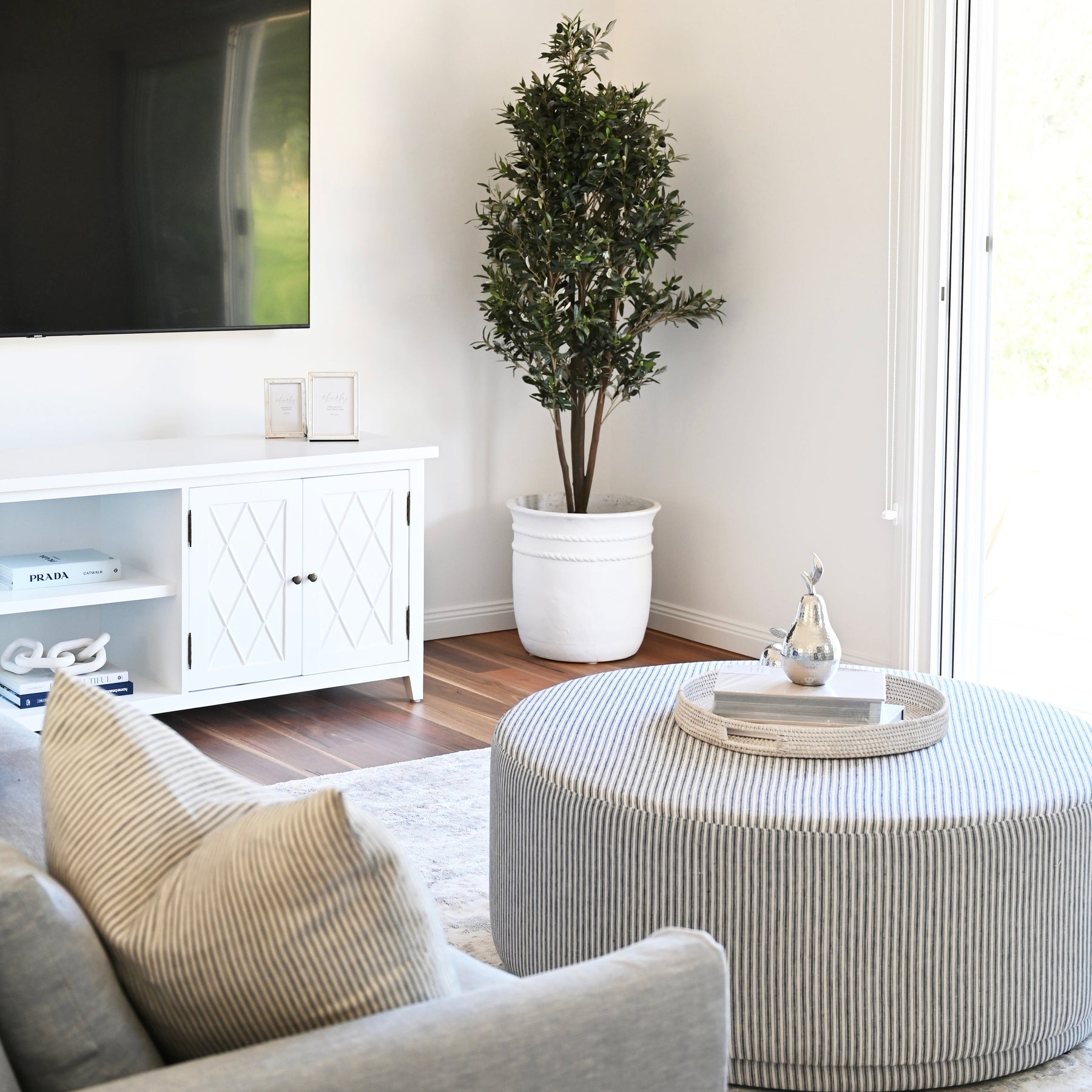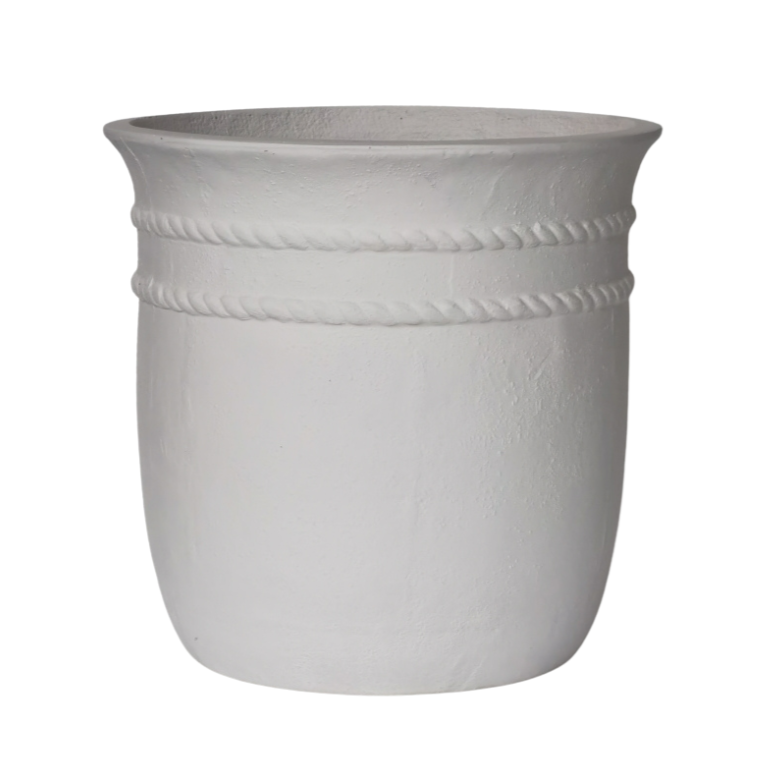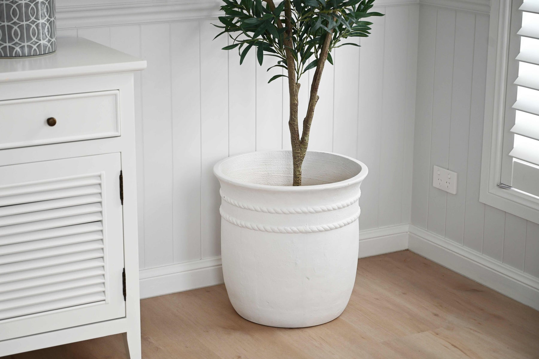 Fibre clay white round Hamptons-style pot with a smooth, matte finish. This classic, lightweight planter adds a coastal charm, perfect for indoor or outdoor use