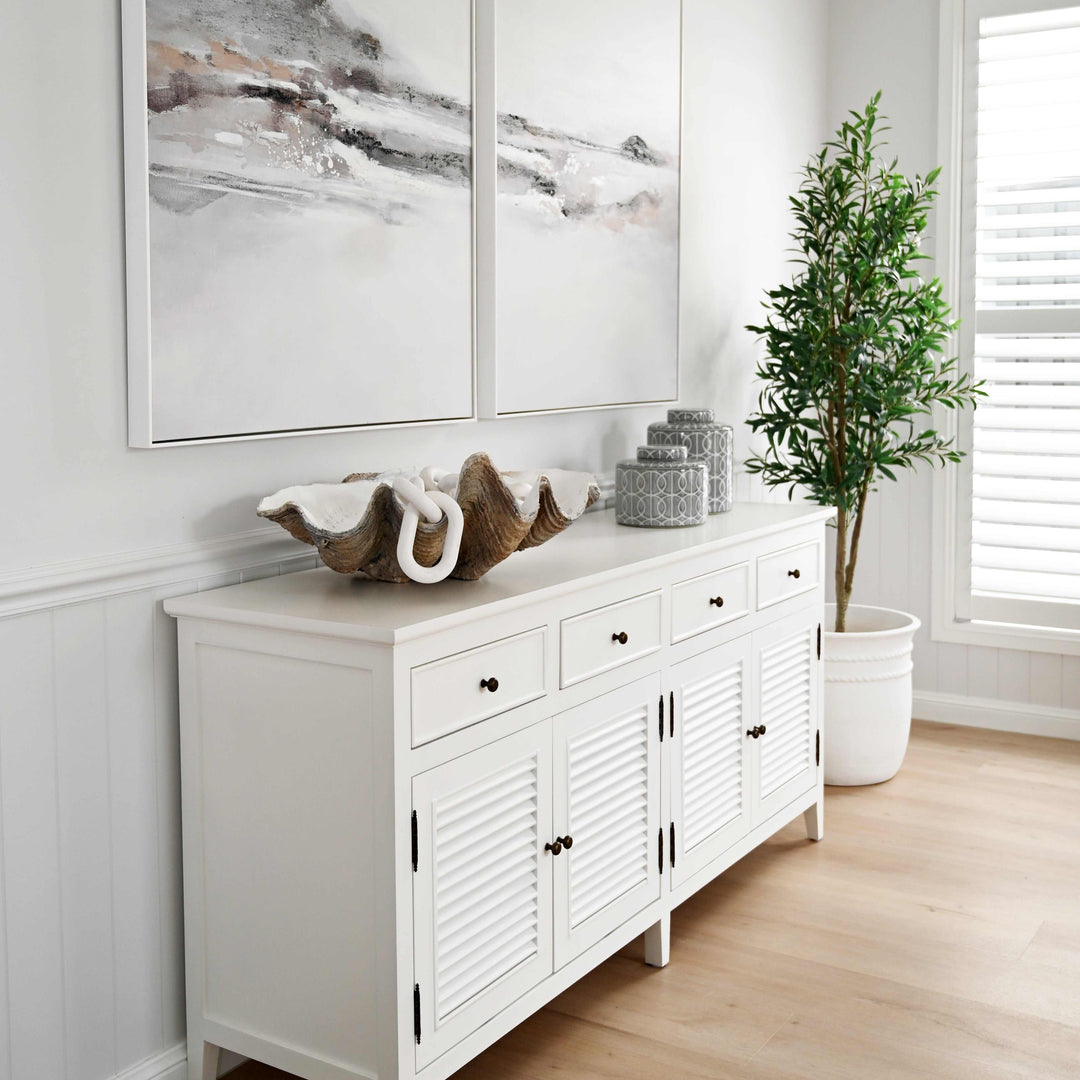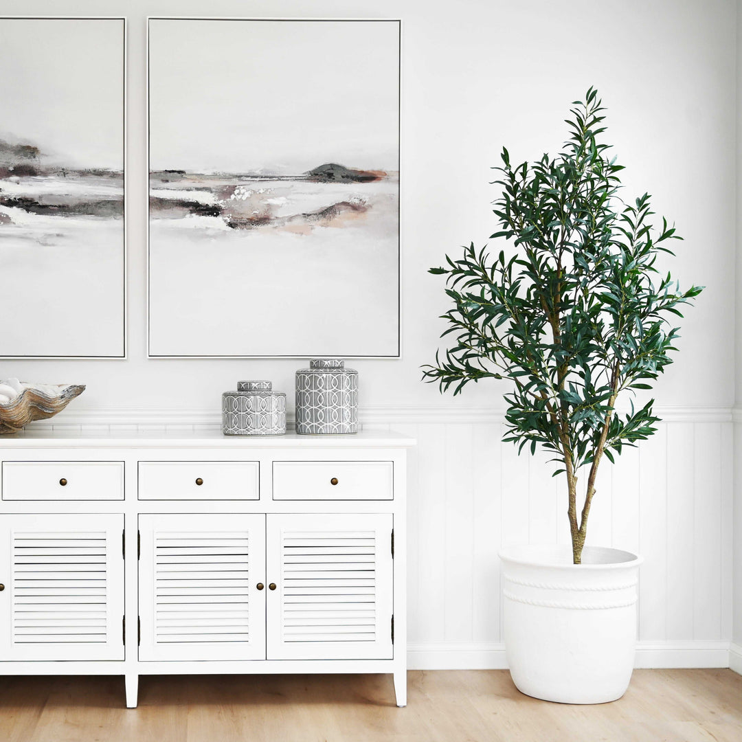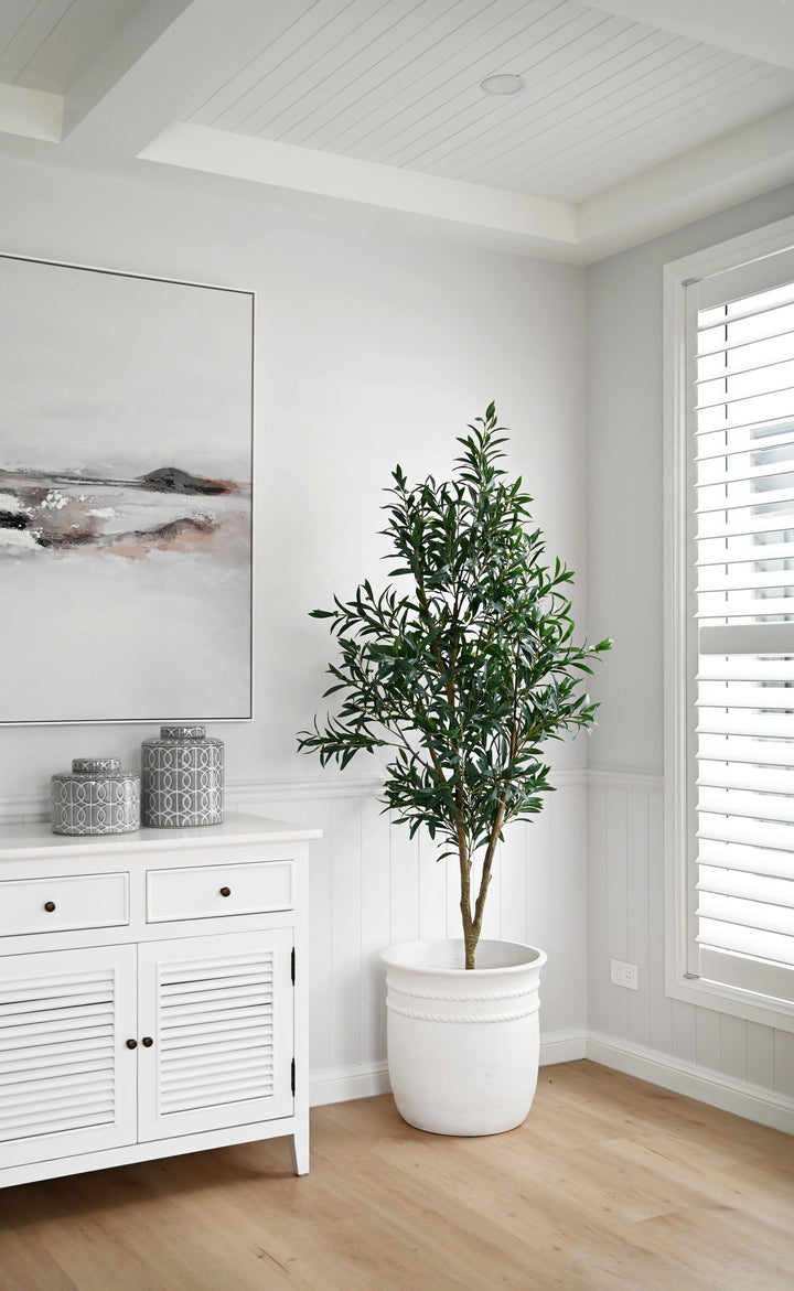 Fibre clay white round Hamptons-style pot with a smooth, matte finish. This classic, lightweight planter adds a coastal charm, perfect for indoor or outdoor use