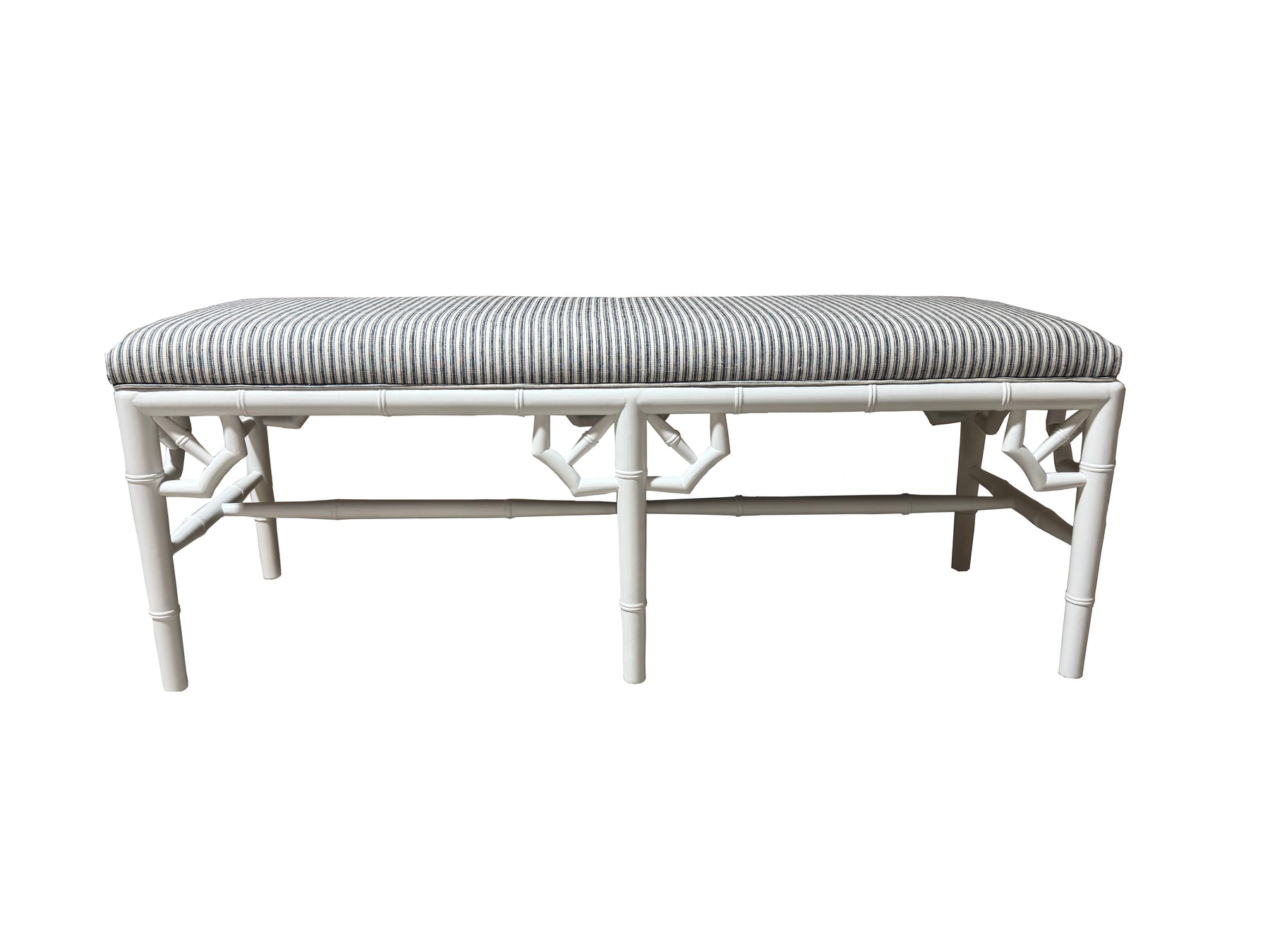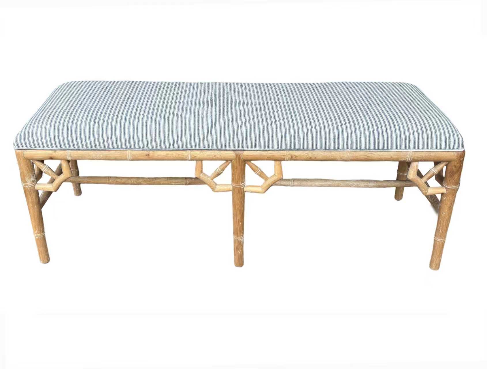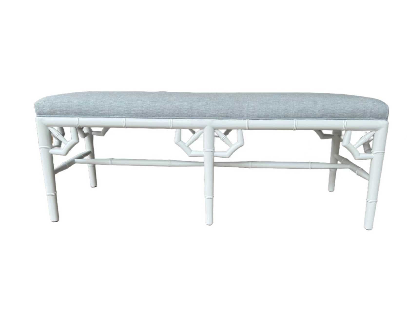 Our ‘Raffles' bench seat features a stunning eye-catching chinoiserie inspired bamboo design. The seat is cushioned, very comfortable and upholstered in 100% linen. Place at the end of your bed, under a window, in an entry or hallway.