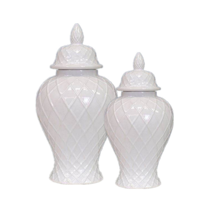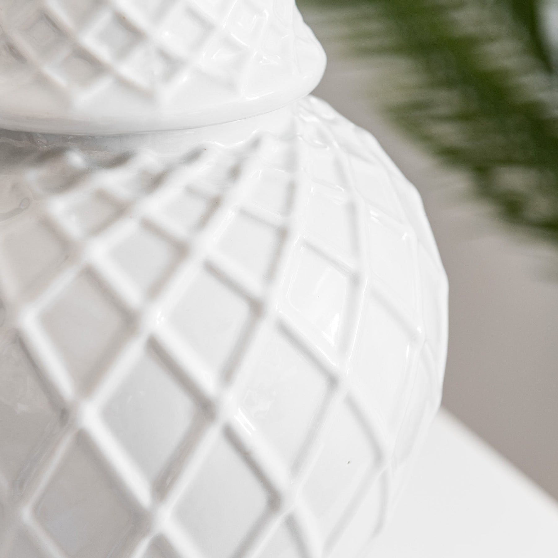 The 'Intertwine' ginger jar features beautiful raised detailing in a braided pattern and is hand made in a classic white hue. This jar is the perfect piece of decor to style with as it will add height and texture to your look.