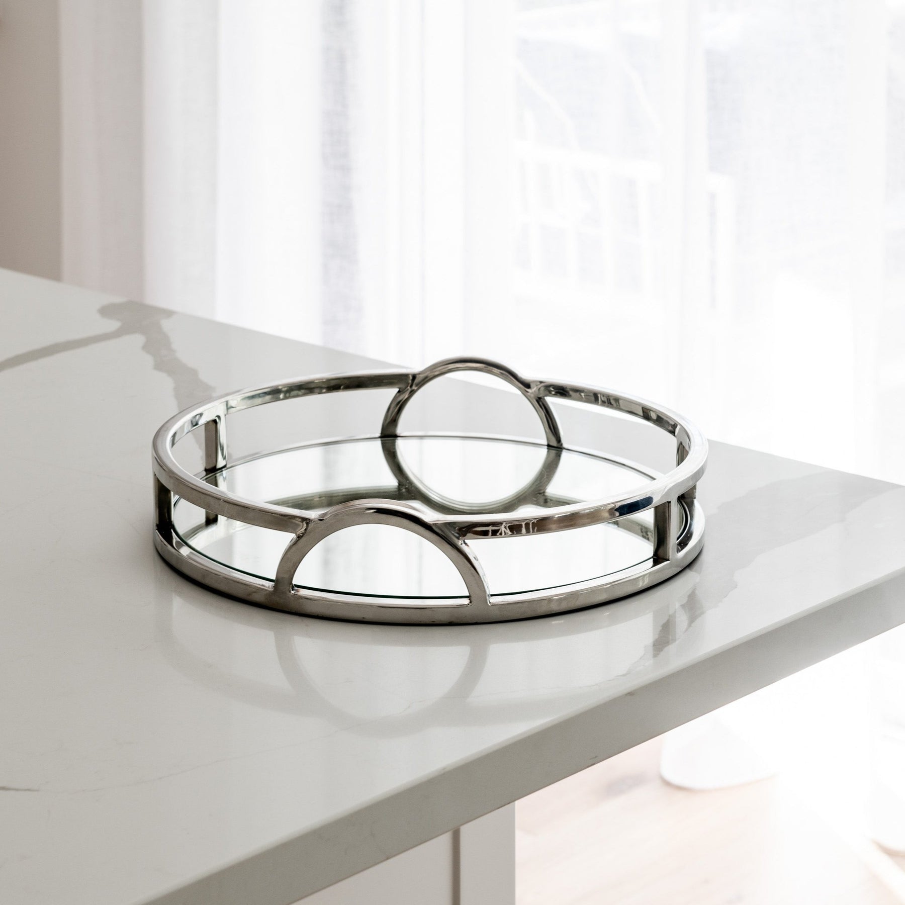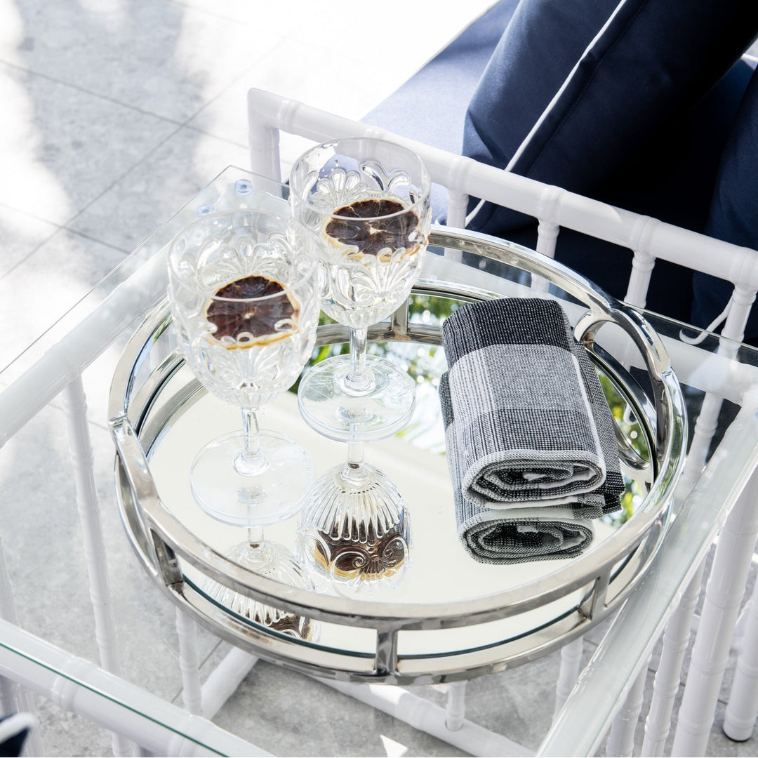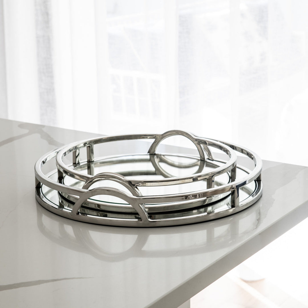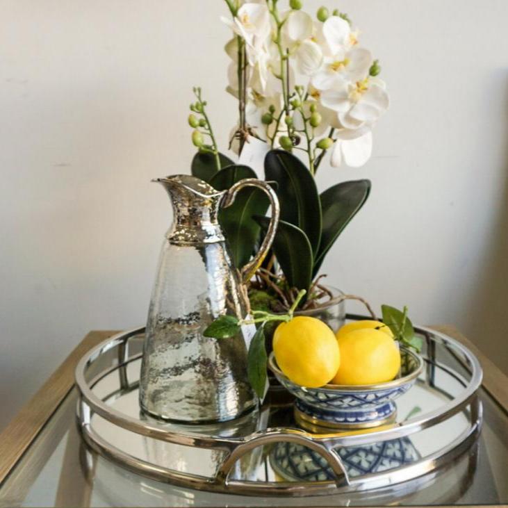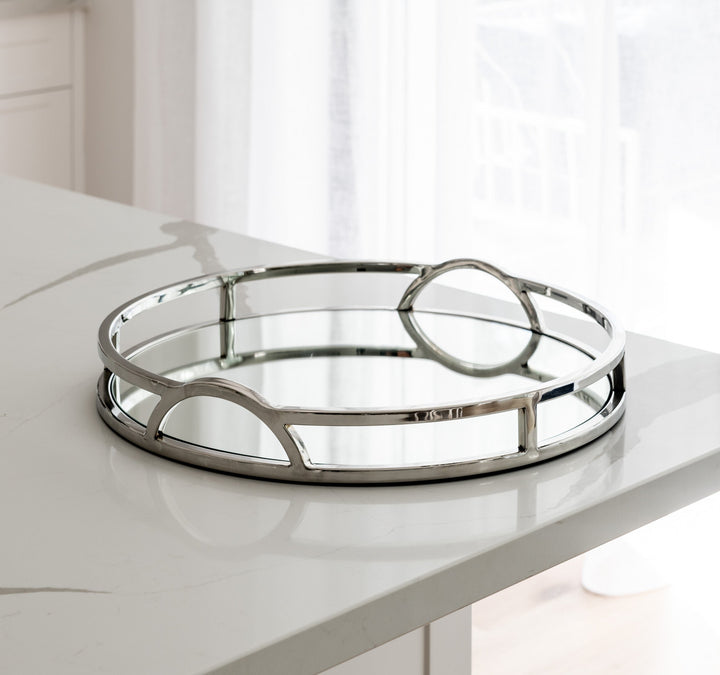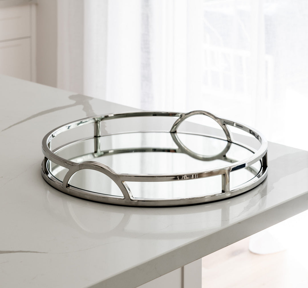 The 'Arch' round silver mirrored tray with handles adds chic sophistication to any space. Its mirrored base and arch handles make it the perfect tray for any Hamptons-style home. This tray will elevate your styling on coffee tables, bookcases and consoles. Use it to add a touch of elegance to your interior decor!