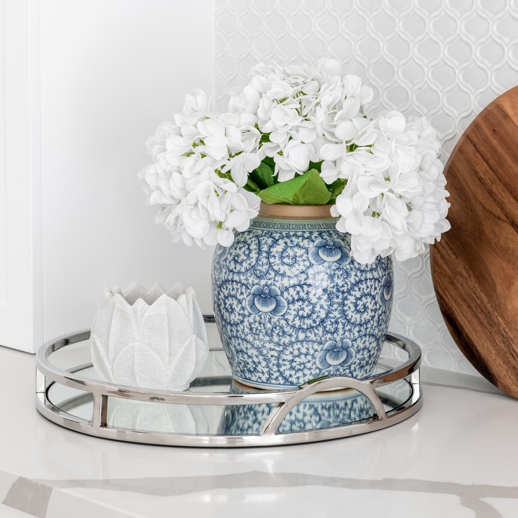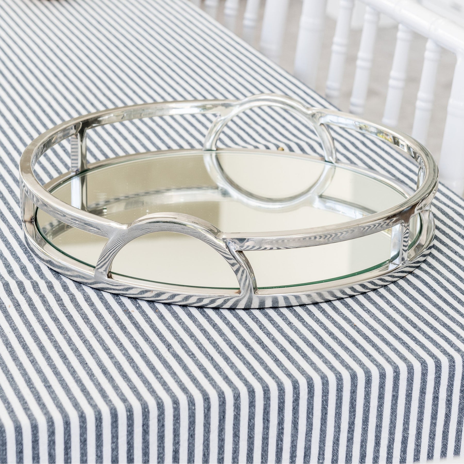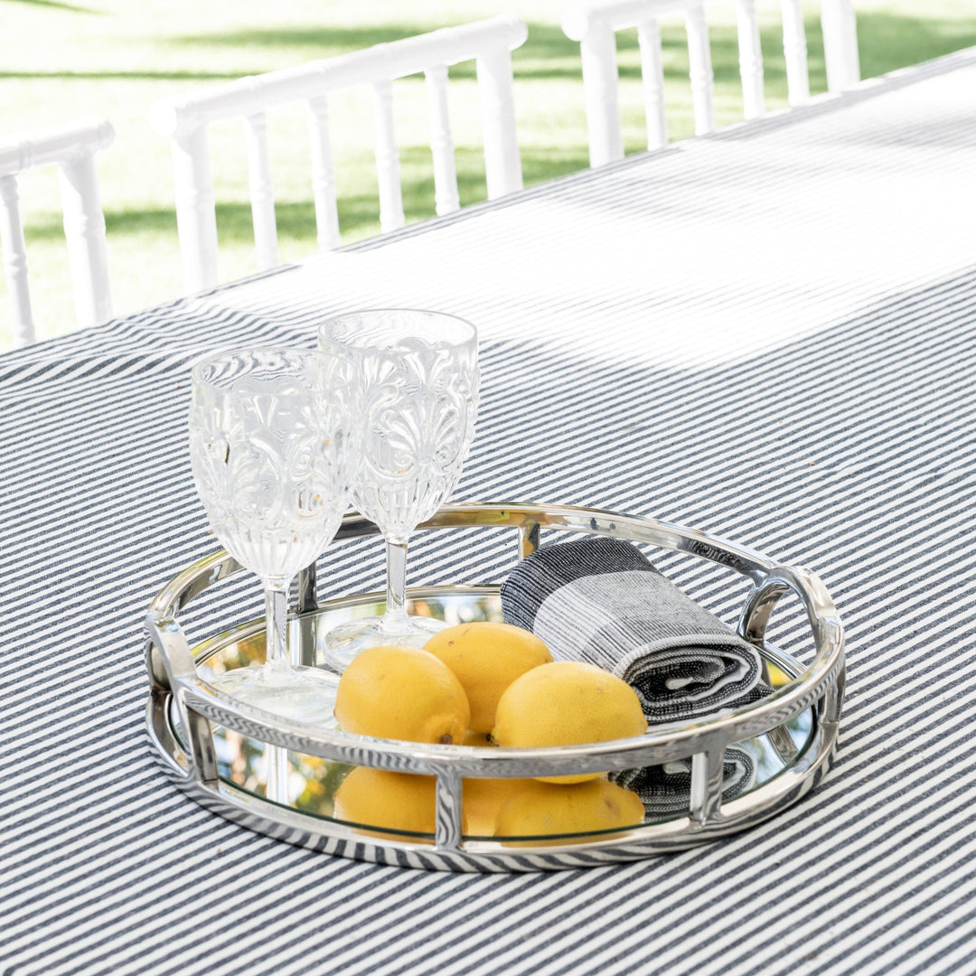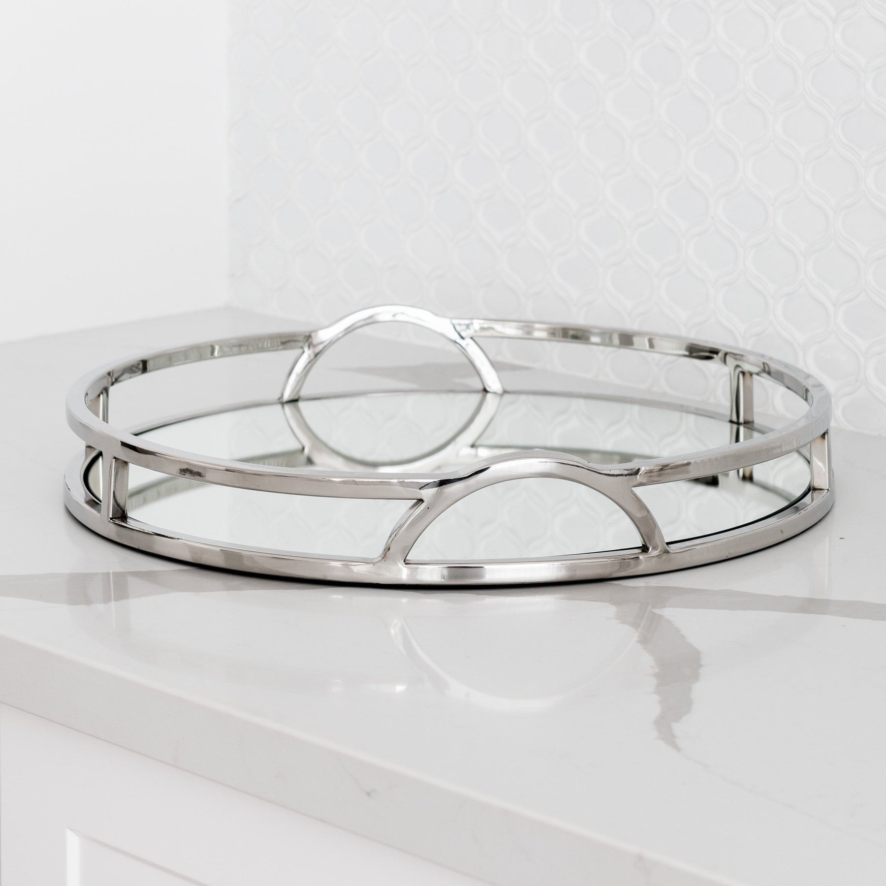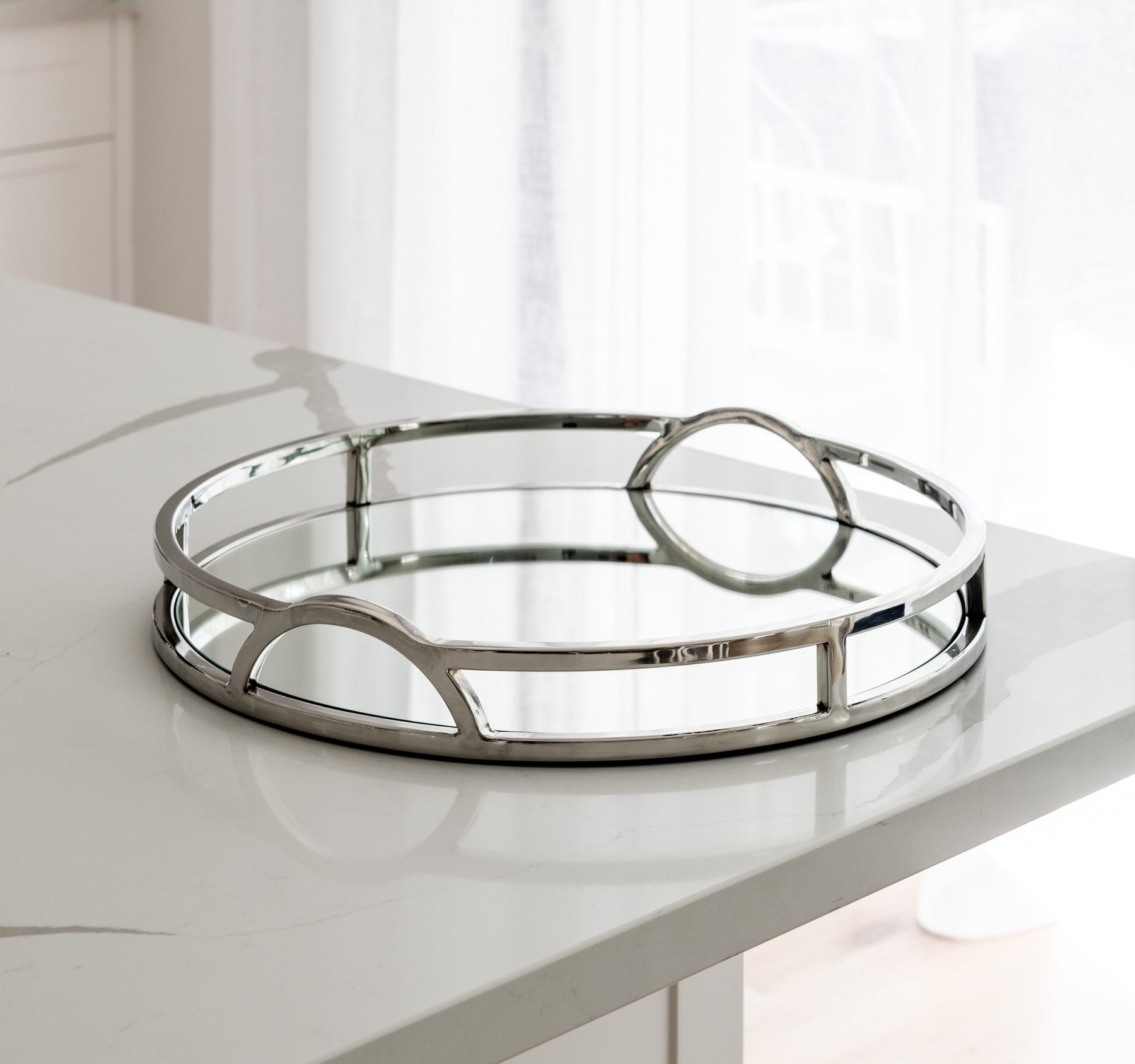 The 'Arch' round silver mirrored tray with handles adds chic sophistication to any space. Its mirrored base and arch handles make it the perfect tray for any Hamptons-style home. This tray will elevate your styling on coffee tables, bookcases and consoles. Use it to add a touch of elegance to your interior decor!