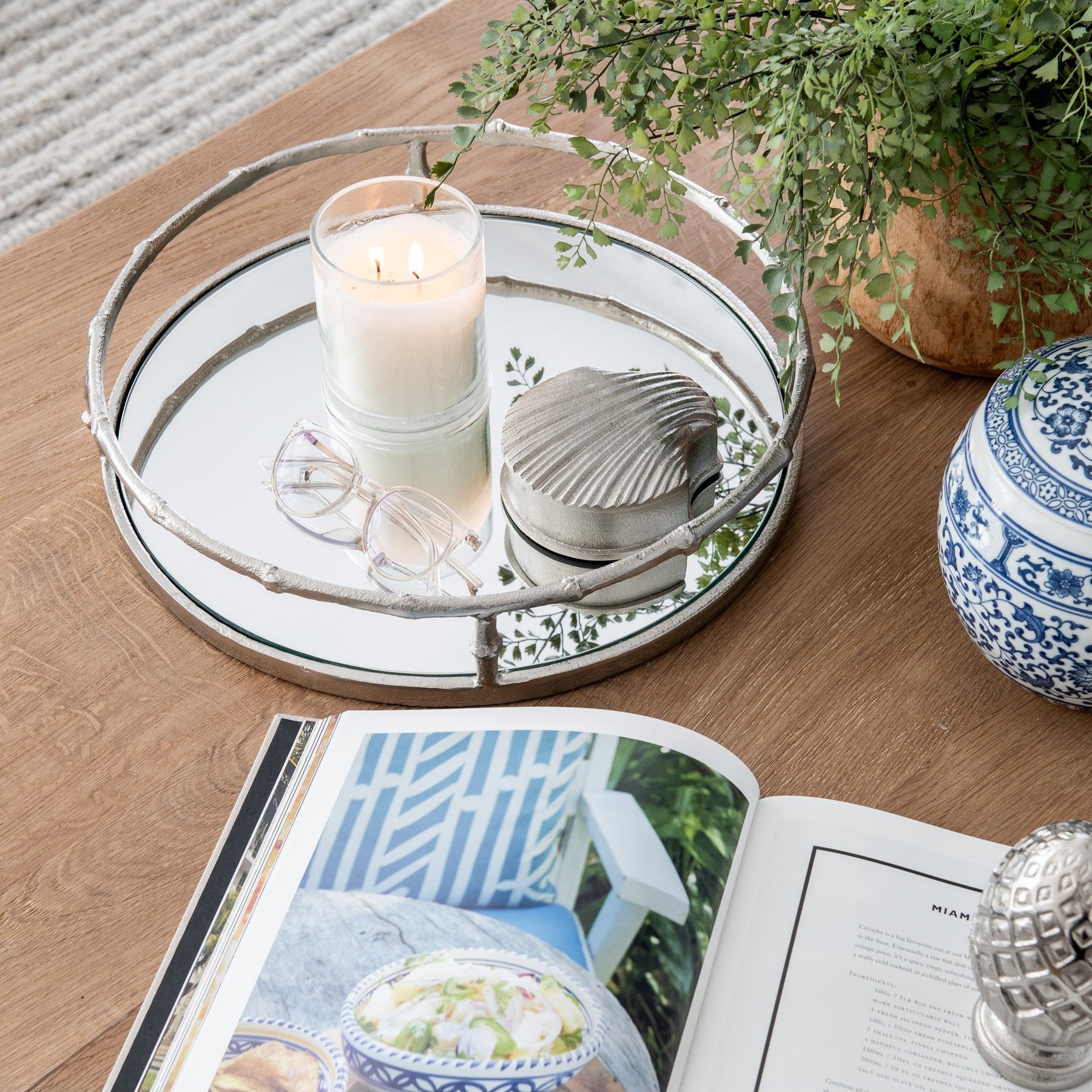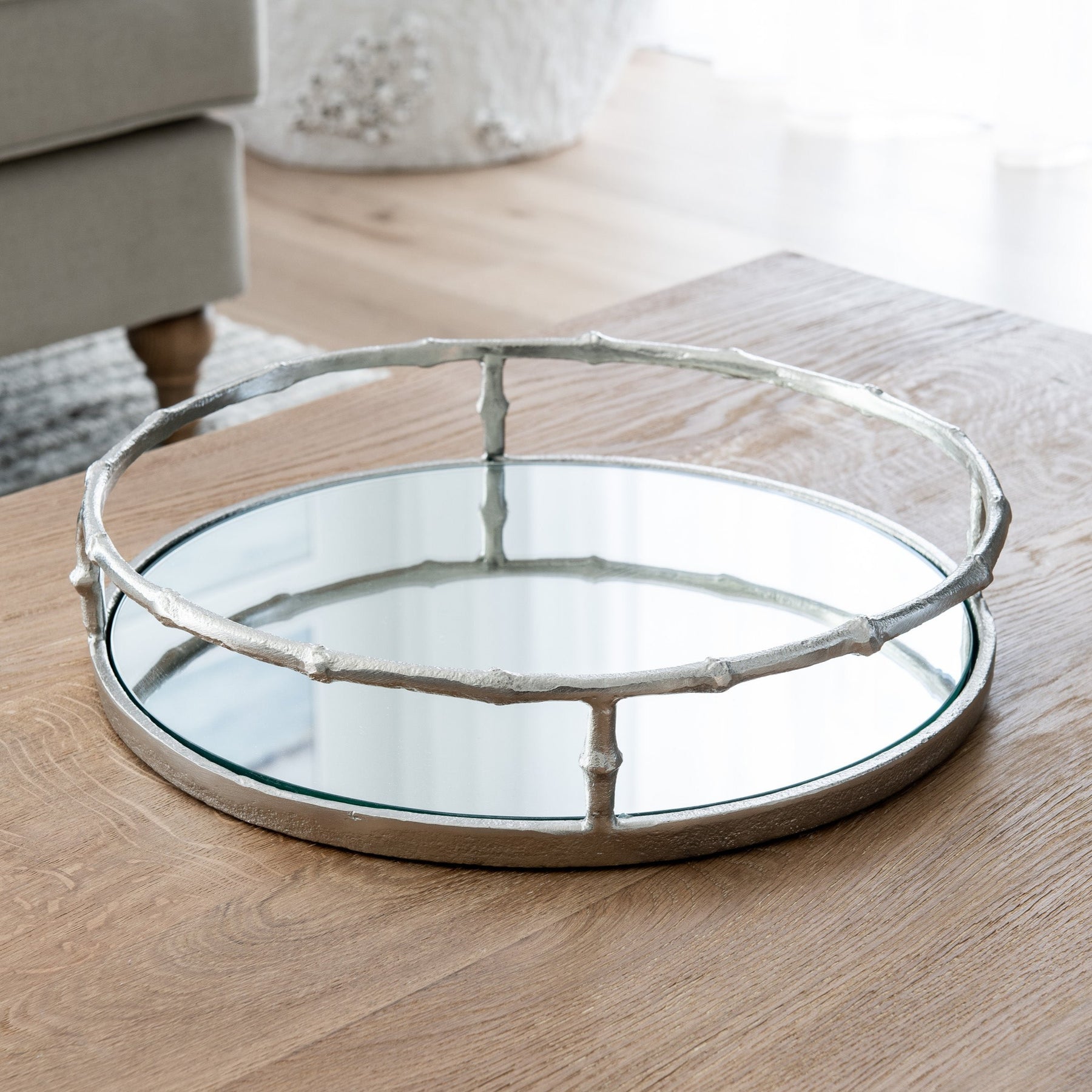 This unique decorative 'Bamboo' round mirrored tray adds a stylish touch to your interiors. It features a gorgeous bamboo mould and is available in two sizes. Perfect for displaying items around your home and elevating your styling, this is a great addition to any home. This is also a lovely gift idea.