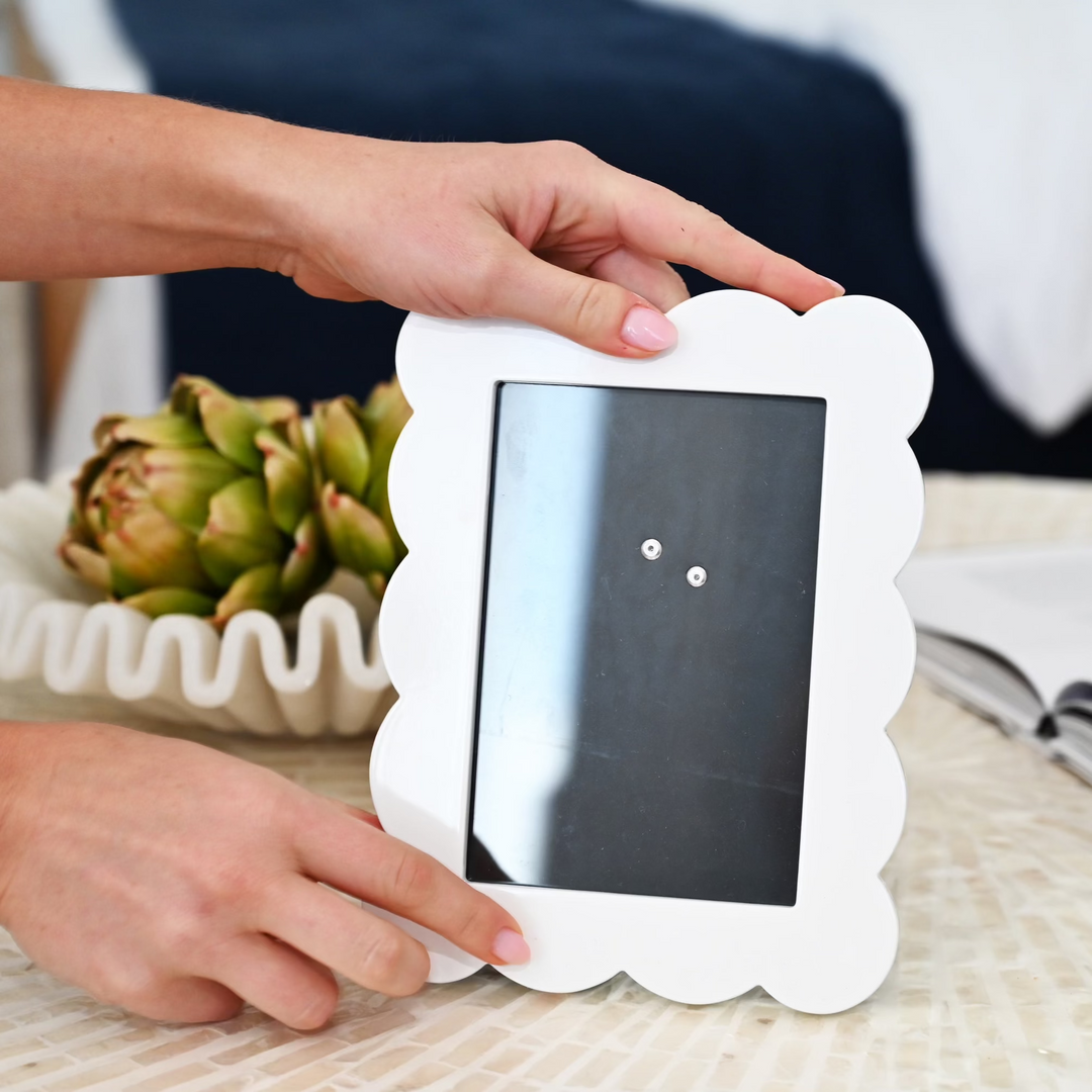 This Scallop White Photo Frame is expertly crafted and stylish. It is an ideal addition to any interior space, adding personality to your decor. Each frame is finished with between 15- 20 coats of high gloss lacquer, meticulously hand polished between each coat. Complete the look by pairing it with one of our lacquered trays. Available in 4 x 6 inch or 5 x 7 inch sizes.