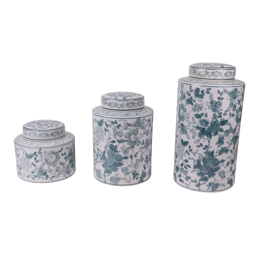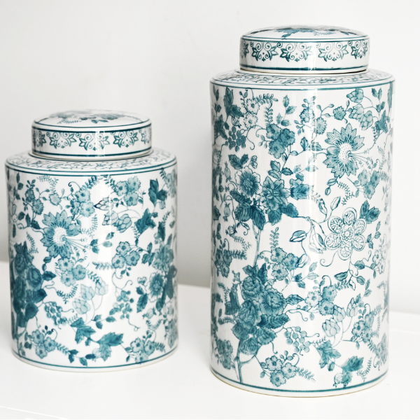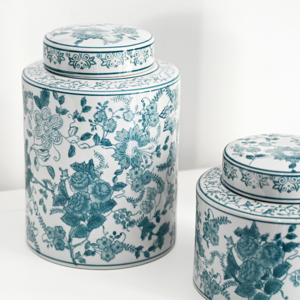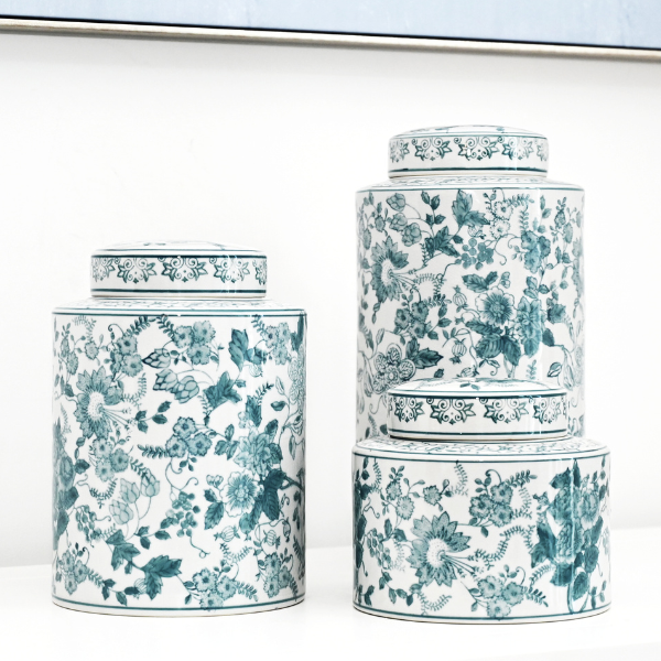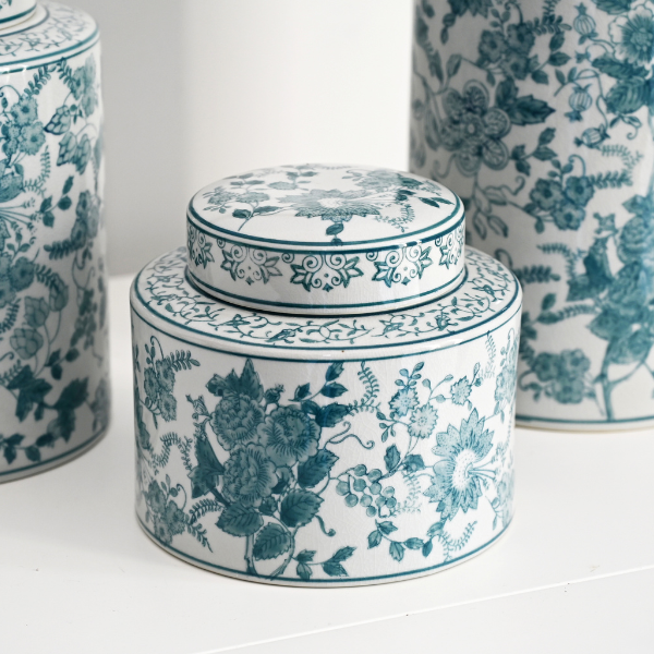 The 'Soft Floral' hand-painted jars are available in three sizes, each showcasing a delicate blue floral design that adds a touch of elegance to both traditional and modern Hamptons-style homes.