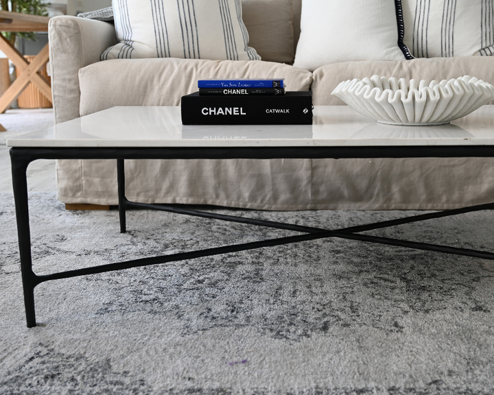 Our 'Soho' rectangular coffee table is breathtaking with its pounded black steel legs and and contrasting sleek white marble top. The 'Soho' pieces would work in both a modern and traditional look and will compliment a variety of decors. The top is made from natural white marble, sourced from Greece. Please note that marble is a natural material and finishes will vary from product to product.