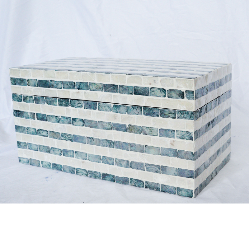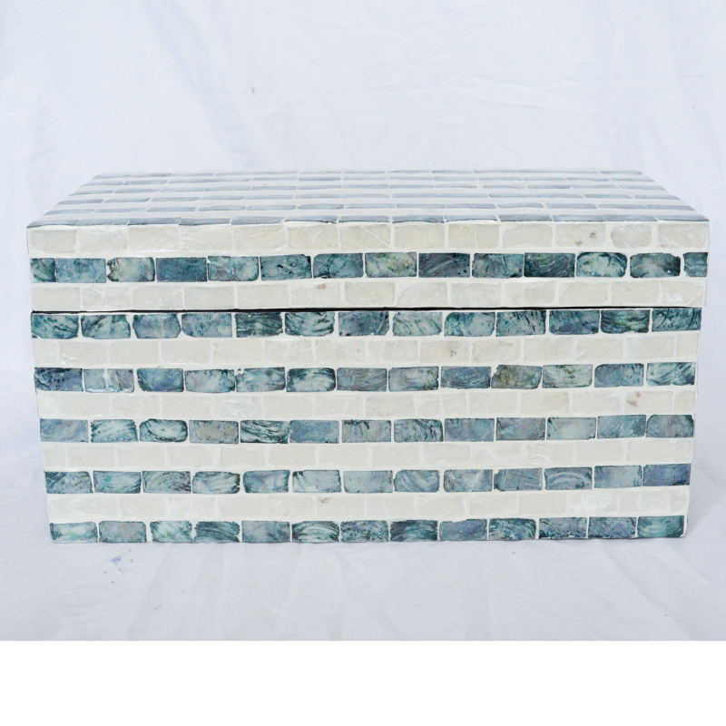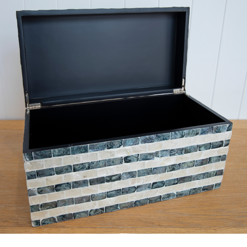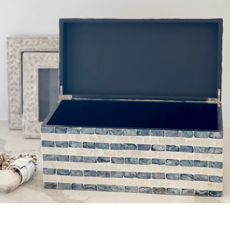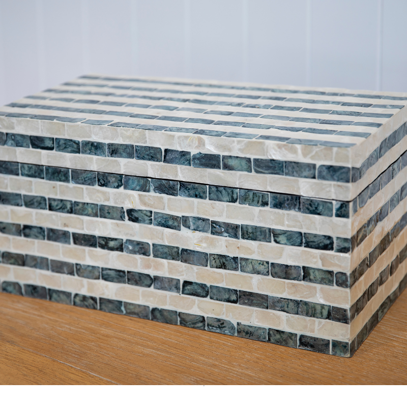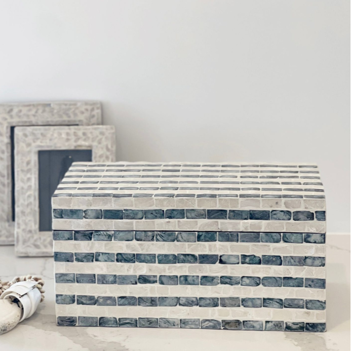 Adorn your book shelves, coffee table and more with this beautiful Mother of Pearl Trinket Box, featuring a stunning stacked inlay design.