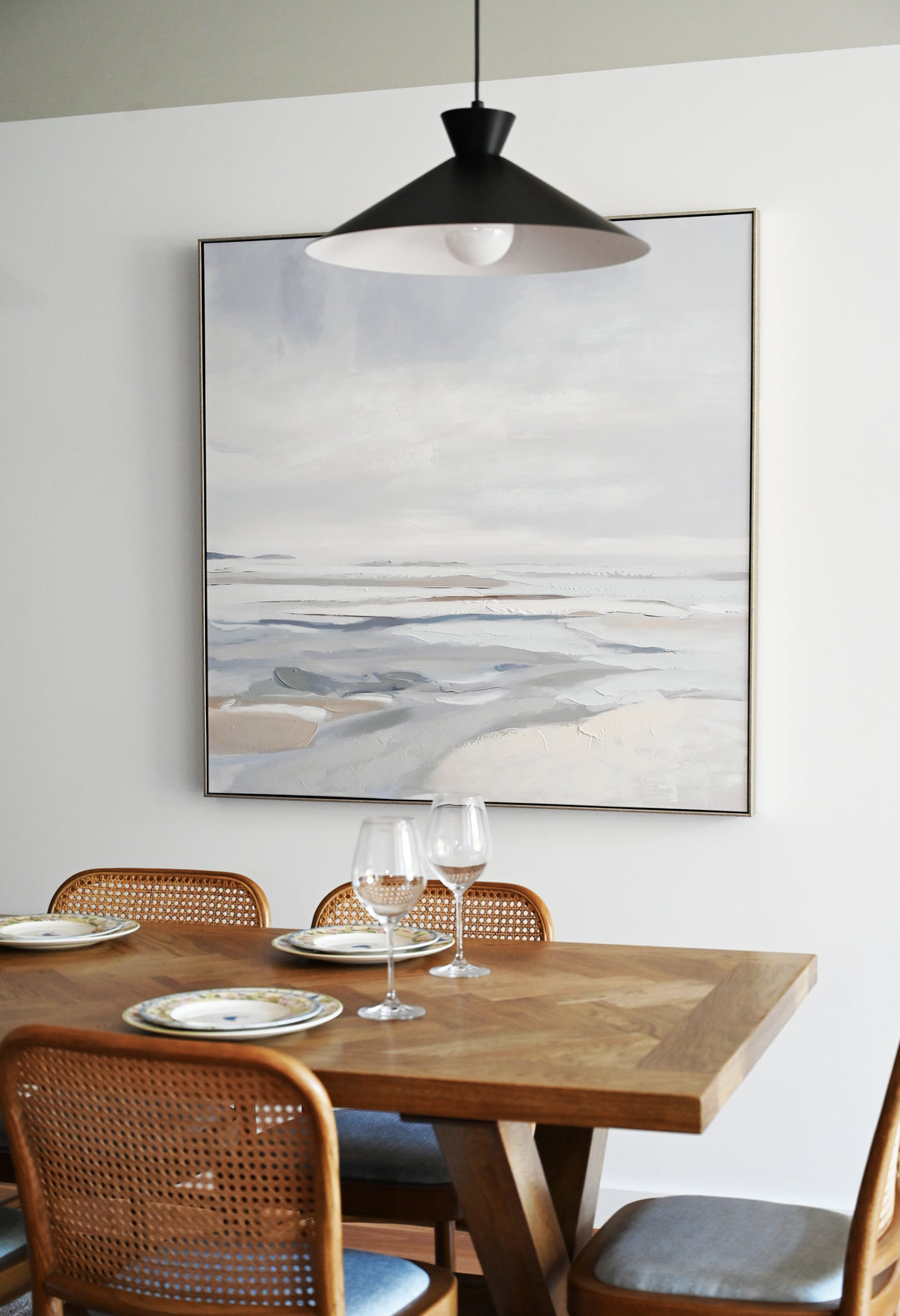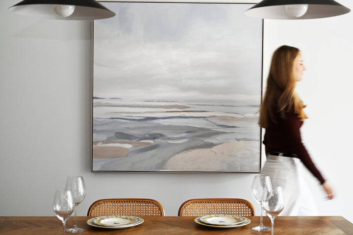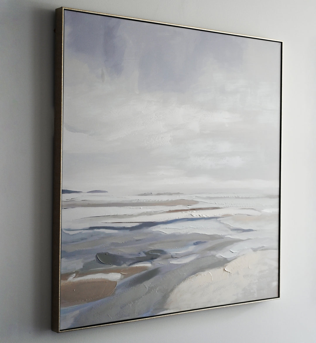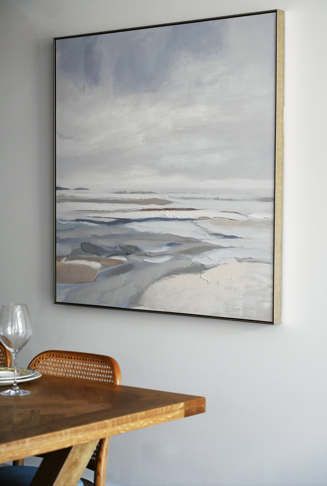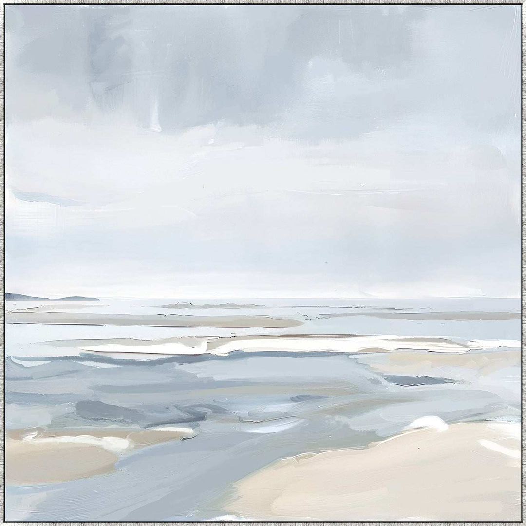 The 'new Tranquil Seashore' Canvas is a stunning depiction of a serene beach landscape. The soothing hues of soft blue and grey provide a striking contrast to the sandy white tones of the dunes. This piece will bring a peaceful ambiance to any home in the Hamptons.